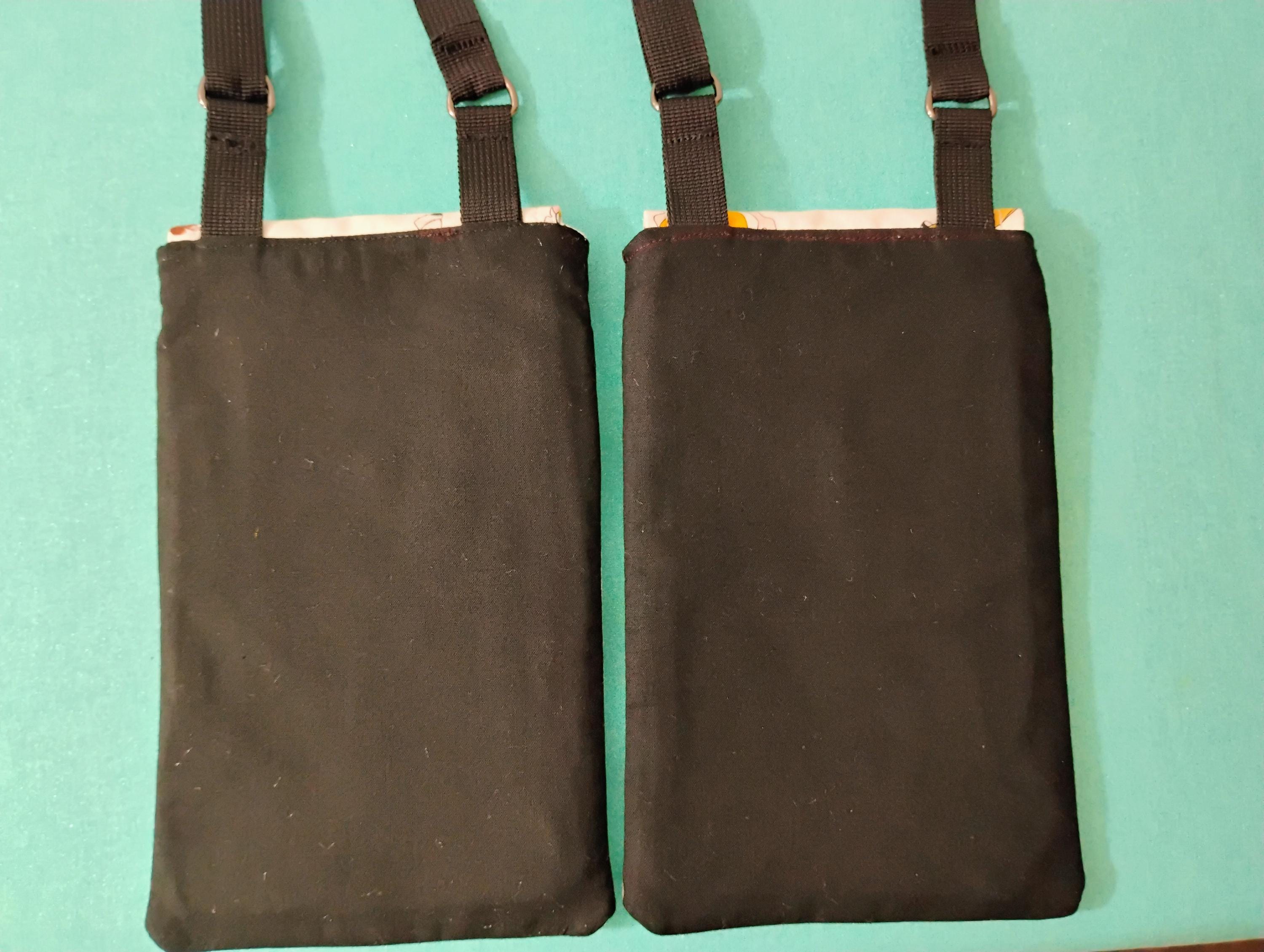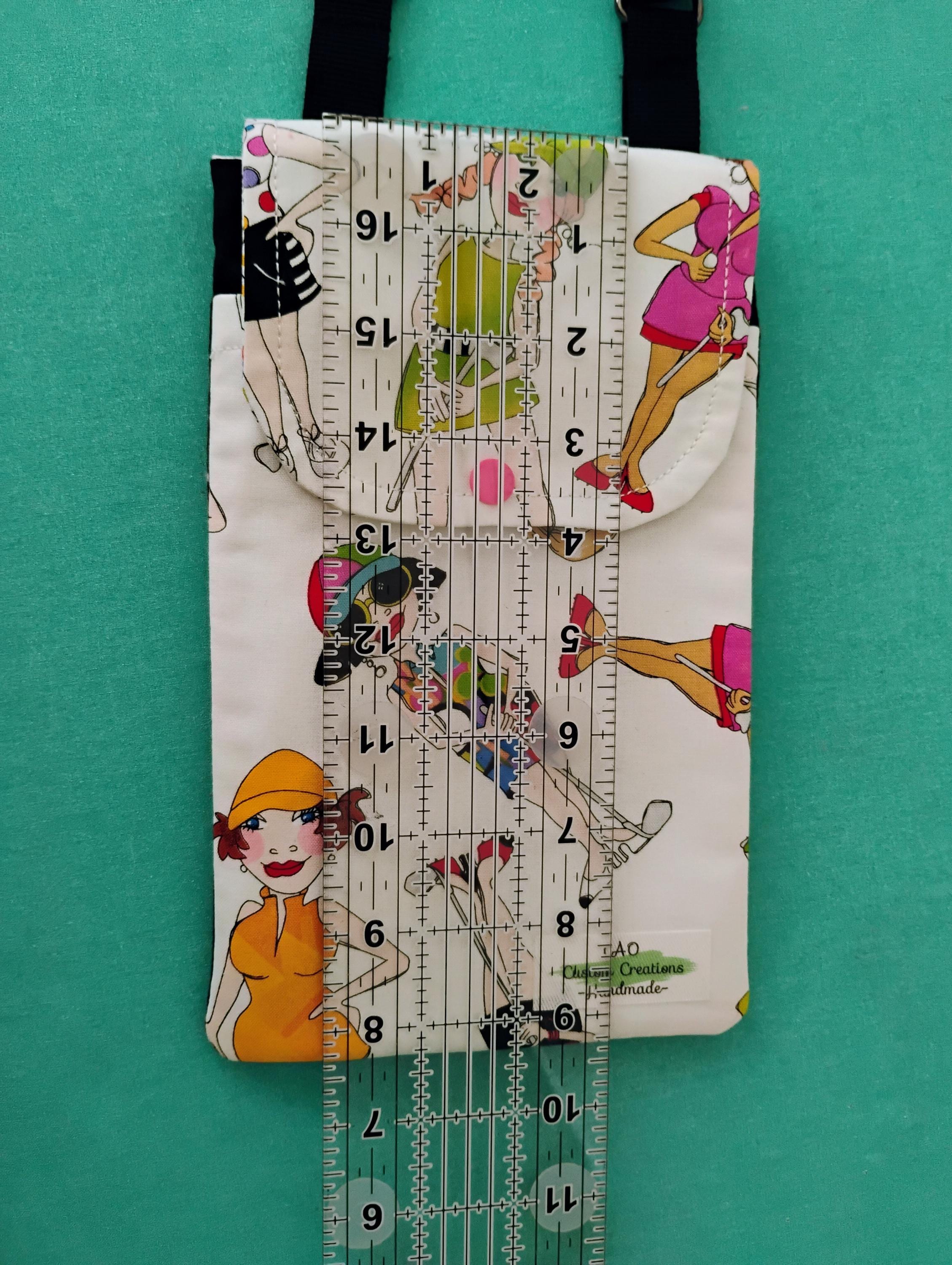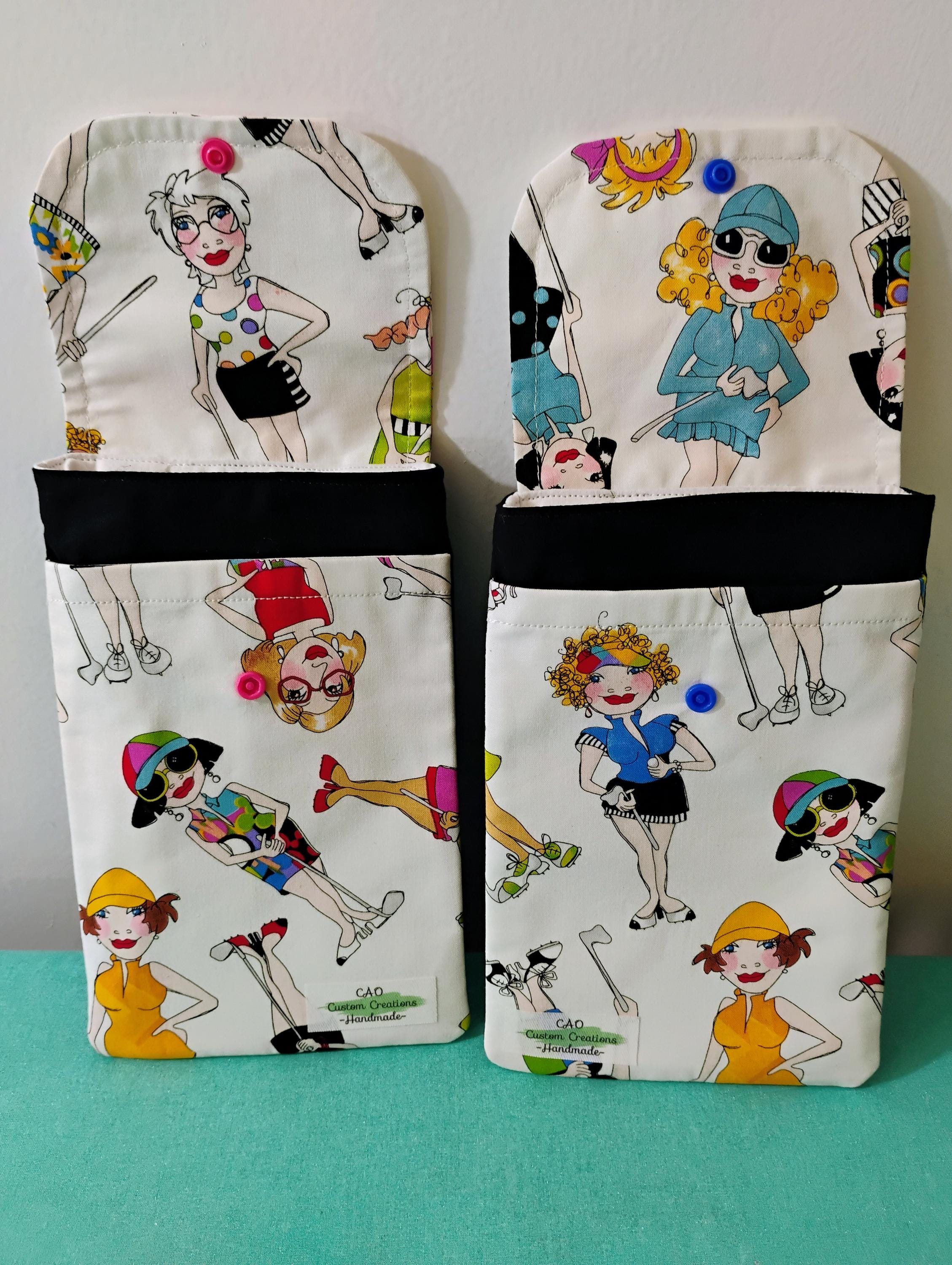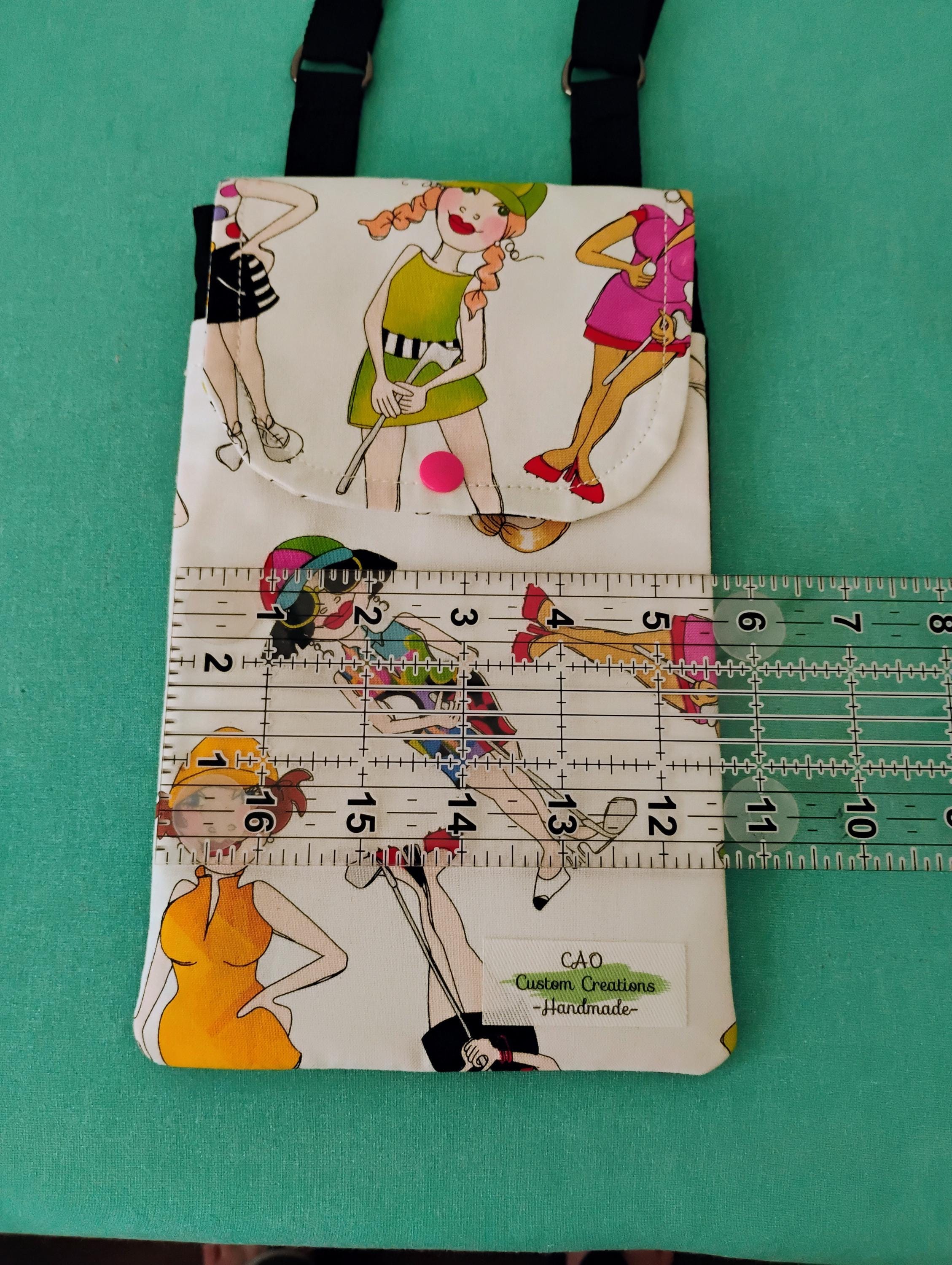 Two Golf Babes Cellphone Bags. Each has a slight difference in design. This is handmade and custom crafted by me. It is made for small, medium, and large cell phones. Two large pockets inside. One for your phone and one for your essentials. The strap can be worn as a crossbody or a shoulder bag. The inside even has a pocket for your license, credit cards, money etc. It is pretty roomy inside for some small essentials as you go about your day. The front flap is closed by a plastic snap. Check out the size pictures. Shipping separate. Please send message as to which design you would like.