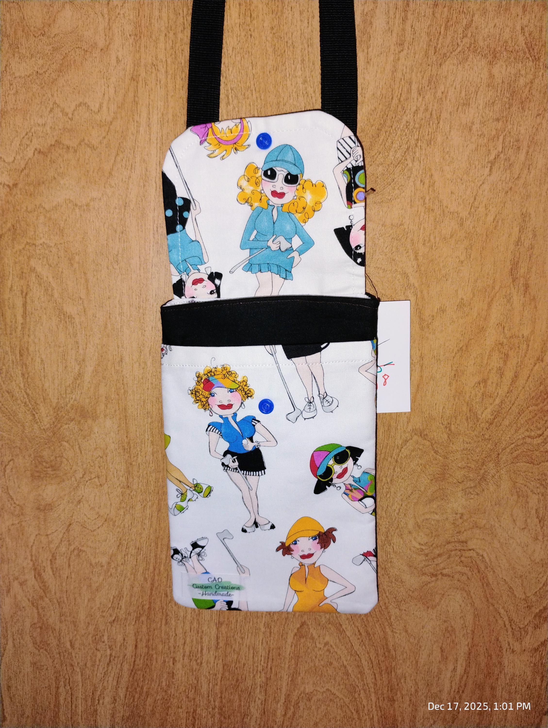 This is handmade and custom crafted by me. It is made for small, medium, and large cell phones. Two large pockets inside. One for your phone and one for your essentials. The strap can be worn as a crossbody or a shoulder bag. The inside even has a pocket for your license, credit cards, money etc. It is pretty roomy inside for some small essentials as you go about your day. The front flap is closed by a plastic snap. Check out the size pictures. Shipping separate.