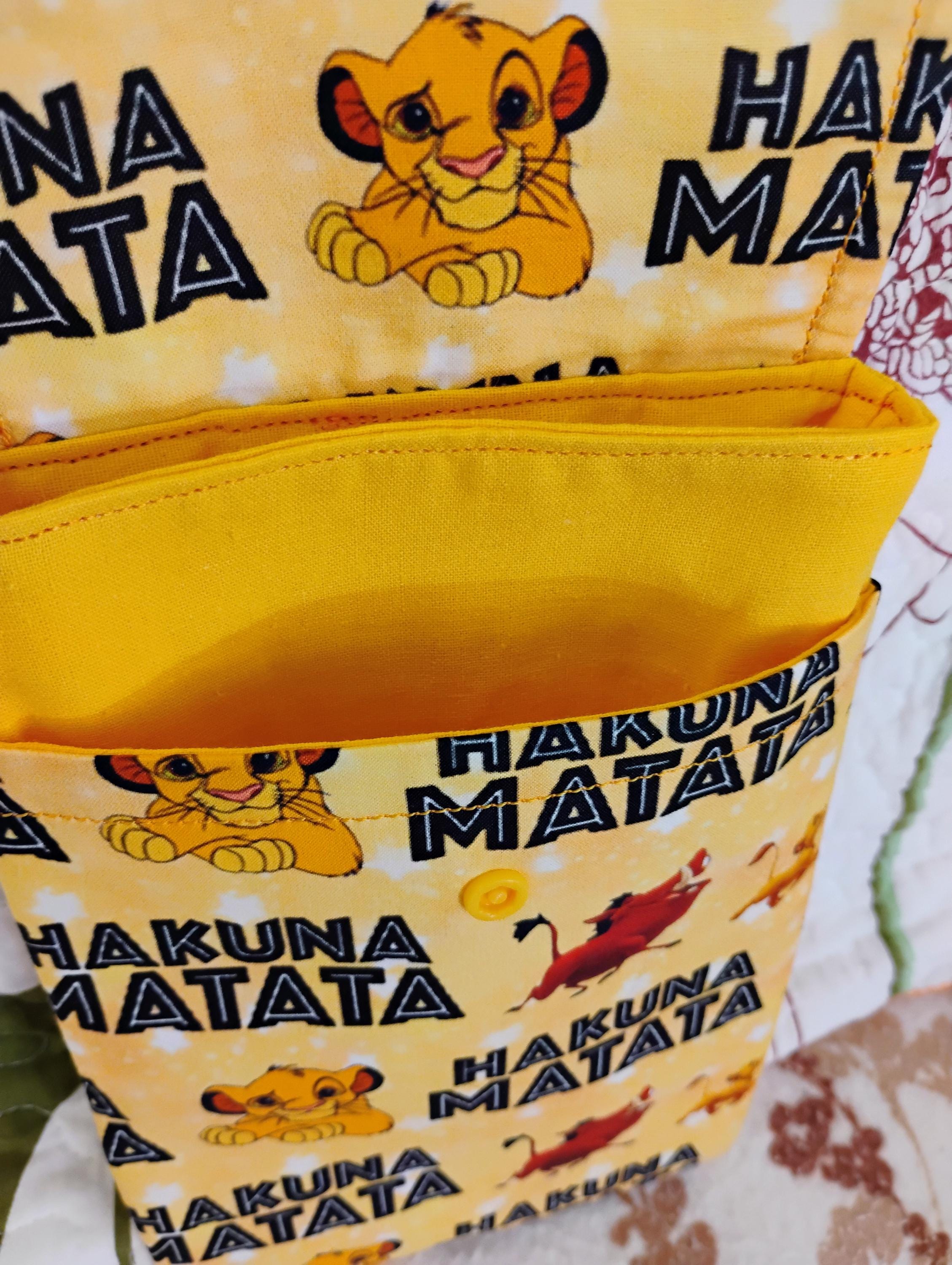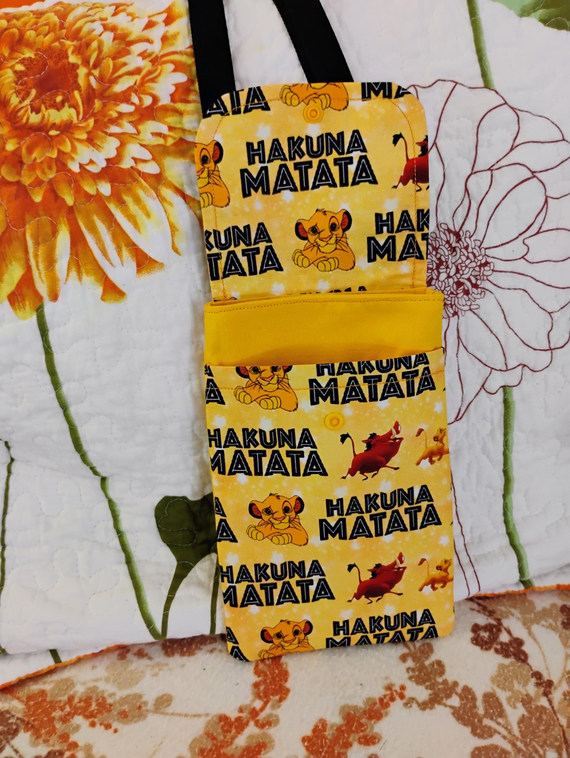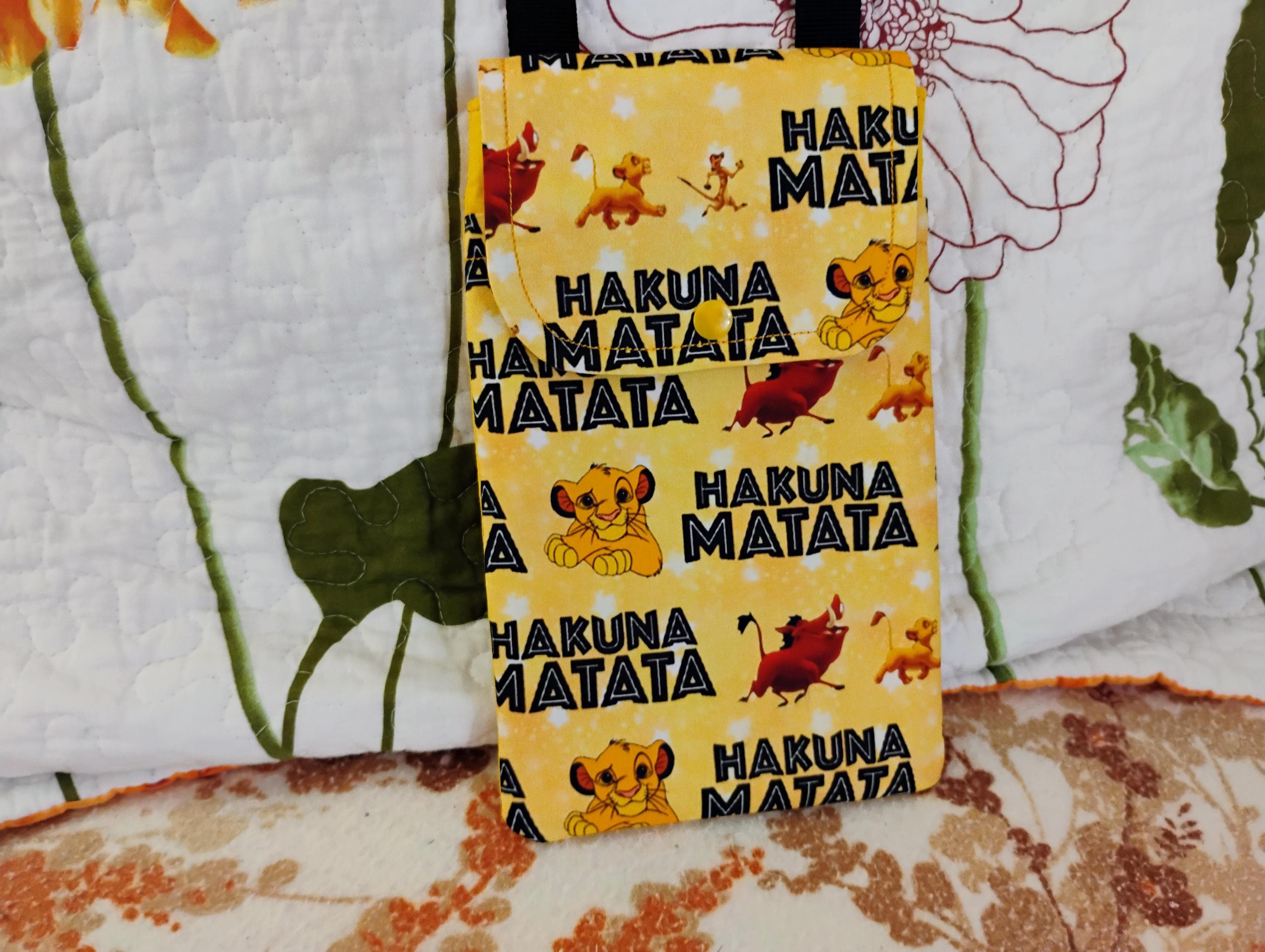 Hakuna Matata cellphone bag, This is handmade and custom crafted by me. It is made for small, medium, and large cell phones. Two large pockets inside. One for your phone and one for your essentials. The strap can be worn as a crossbody or a shoulder bag. The inside even has a pocket for your license, credit cards, money etc. It is pretty roomy inside for some small essentials as you go about your day. The front flap is closed by a plastic snap. Check out the size pictures. Shipping separate.