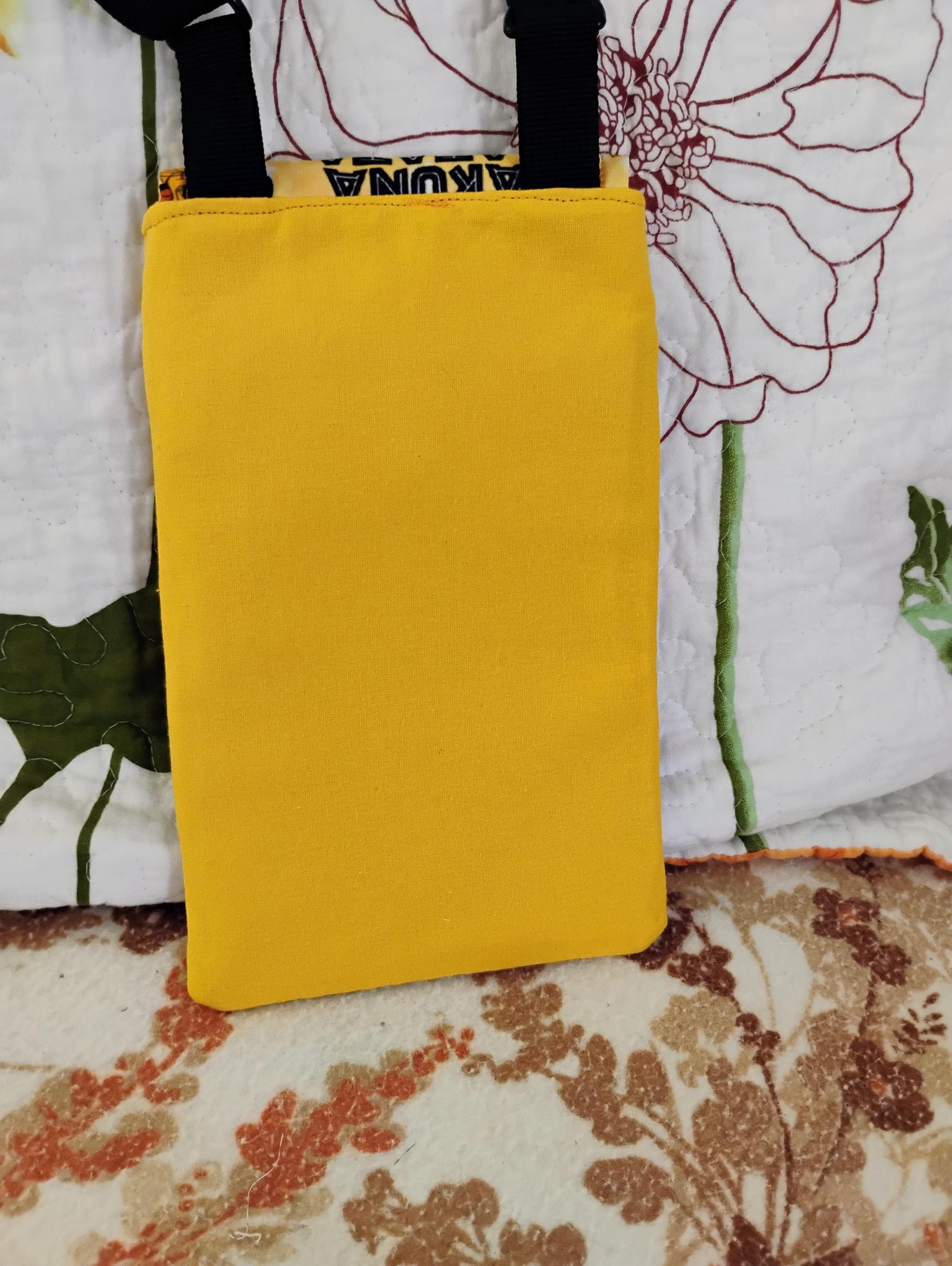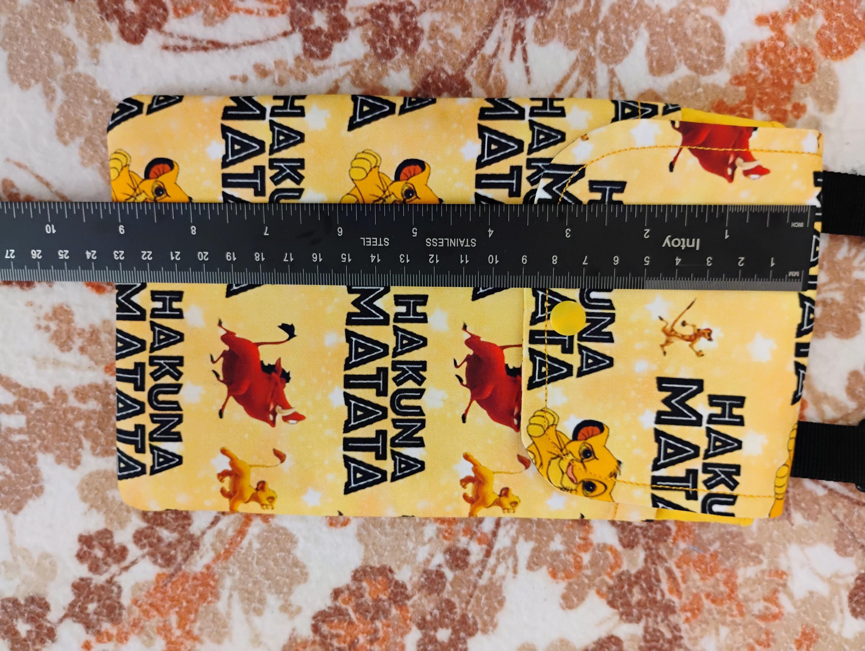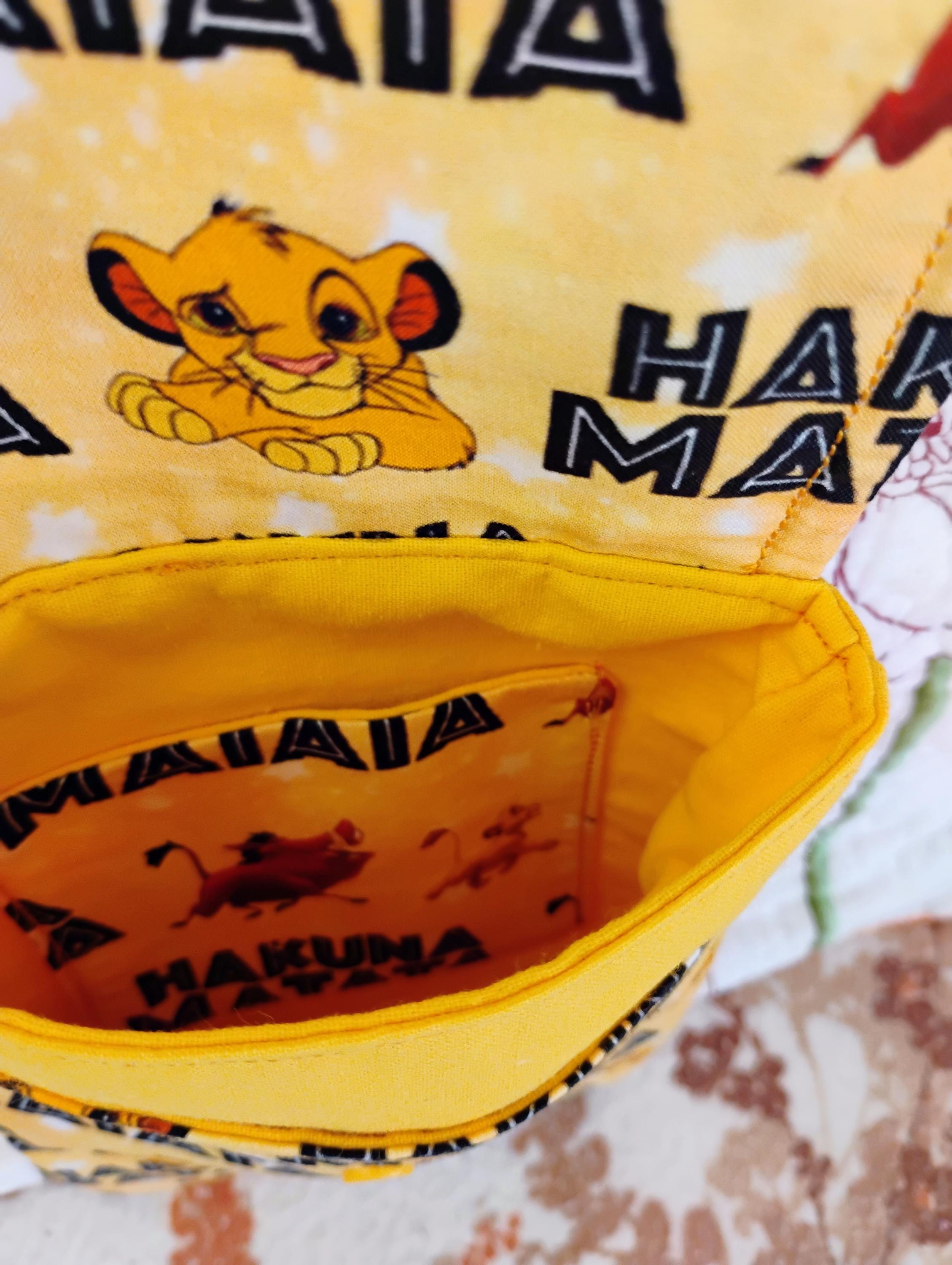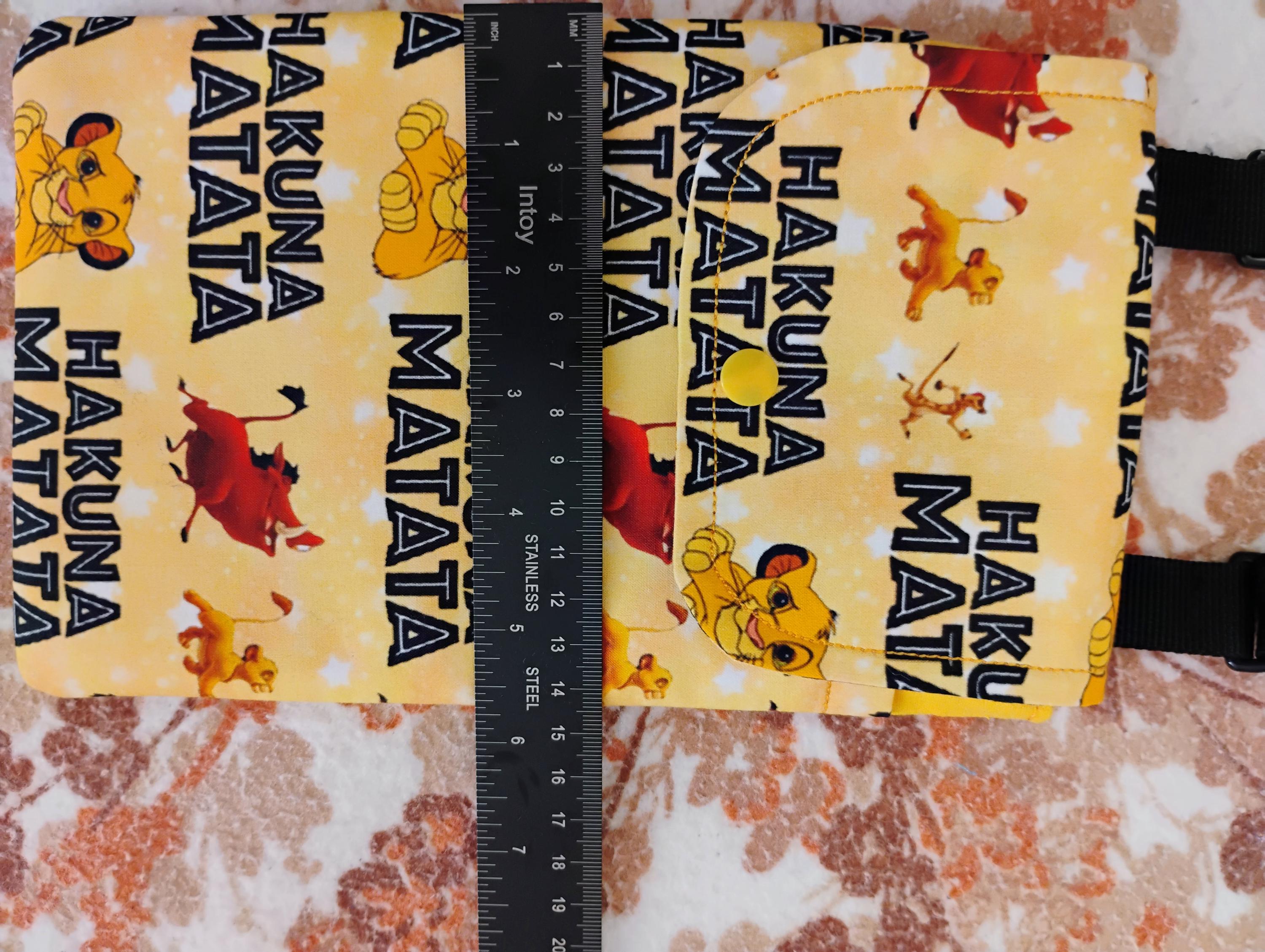 Hakuna Matata cellphone bag, This is handmade and custom crafted by me. It is made for small, medium, and large cell phones. Two large pockets inside. One for your phone and one for your essentials. The strap can be worn as a crossbody or a shoulder bag. The inside even has a pocket for your license, credit cards, money etc. It is pretty roomy inside for some small essentials as you go about your day. The front flap is closed by a plastic snap. Check out the size pictures. Shipping separate.