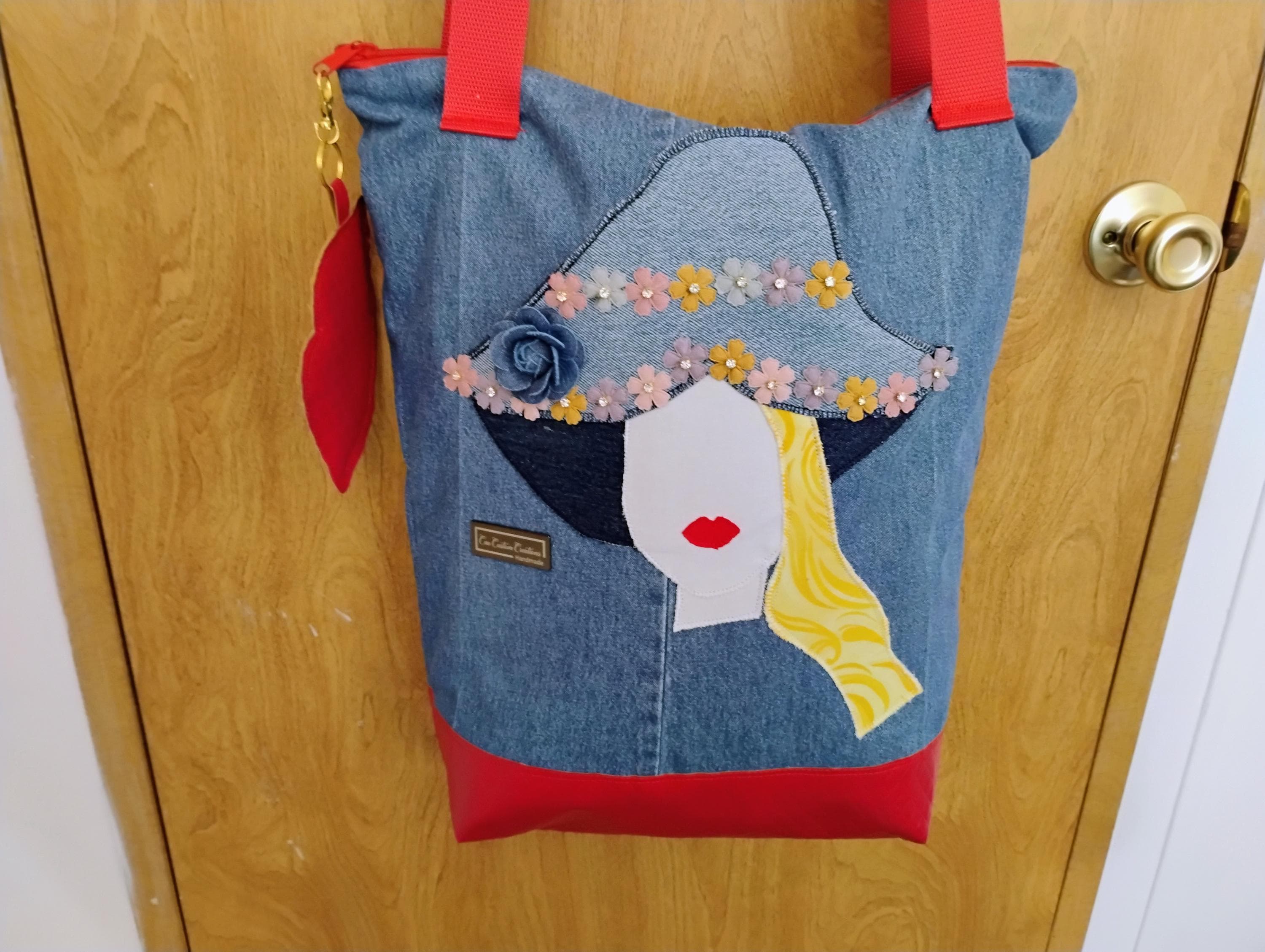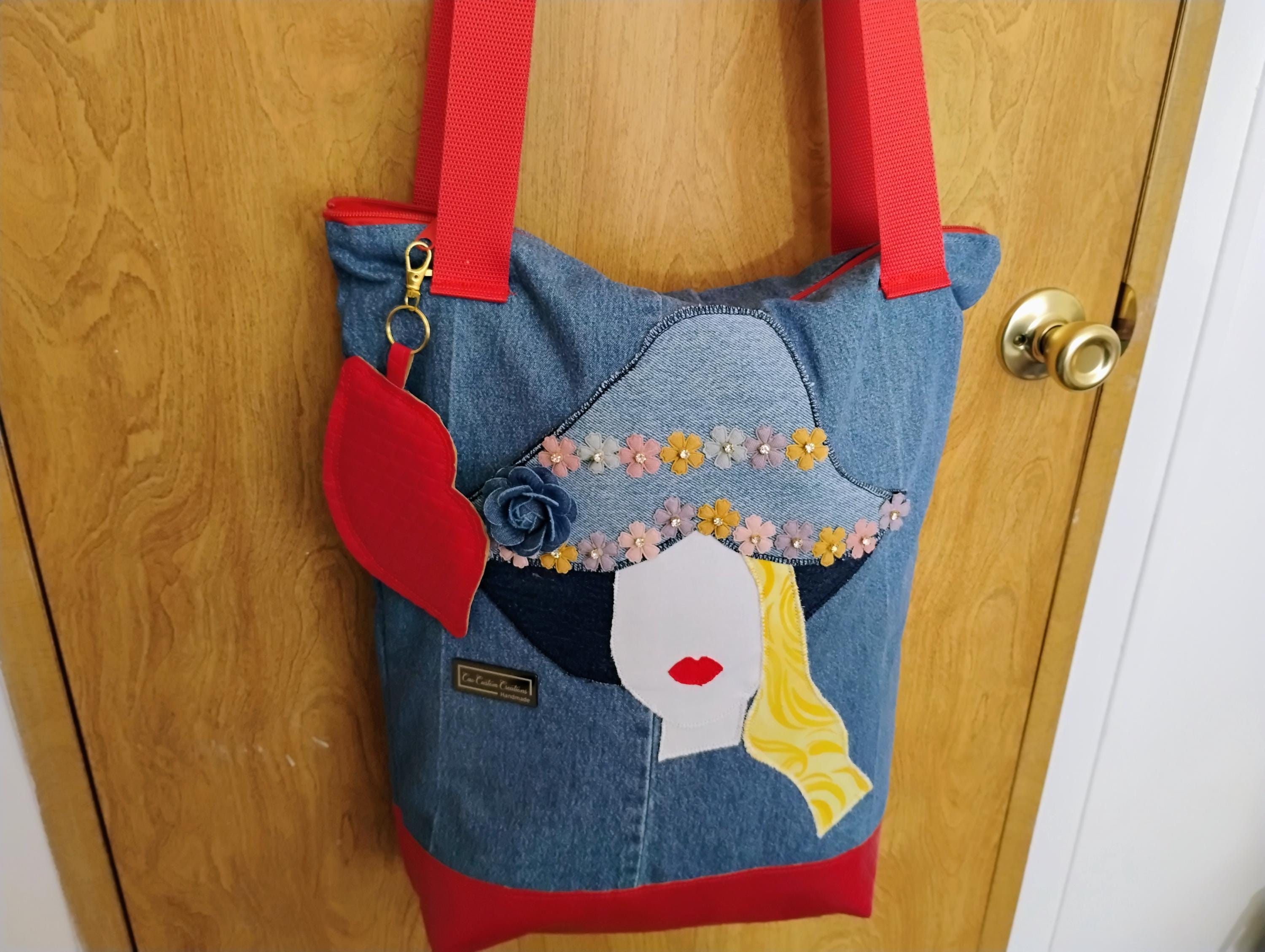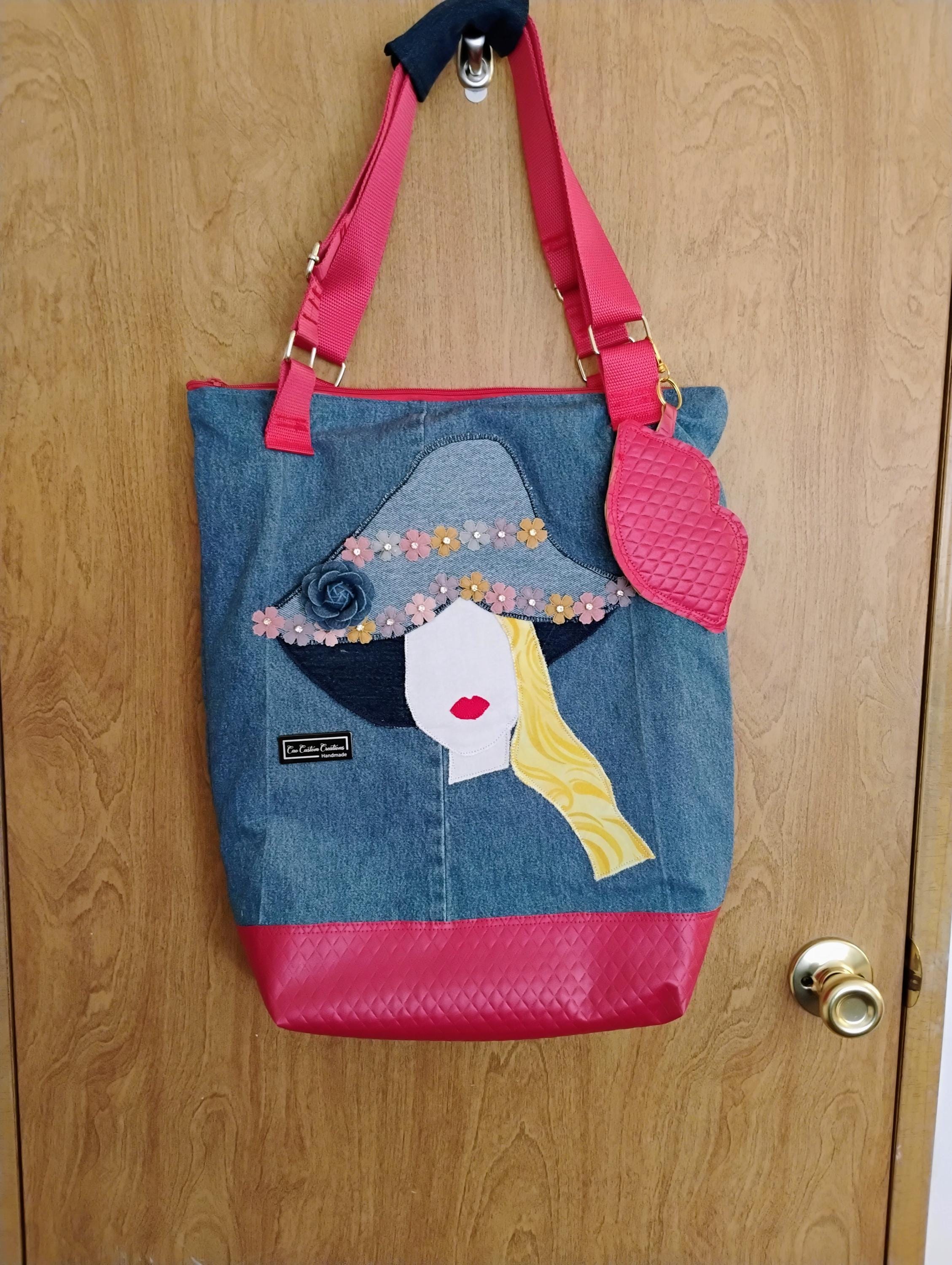 This is an incredible bag with endless possibilities! It's an extra-large bag that can serve as a beach bag, book bag, overnight bag, weekender bag, library bag, craft bag, work bag, and more. Let your creativity run wild! It also makes a fantastic gift for a friend or loved one if you don't need it. The bag is 17.7 inches tall, 13 inches wide, and 4 inches deep. It's crafted from recycled jeans, cotton fabric, and faux leather. The front features a stunning design of a lady in a sunhat, while the back includes a zippered pocket with a decorative faux leather overlay and a jean pocket adorned with a butterfly. The top has a secure zipper closure with a keychain designed to resemble the lady's lips. Inside, there’s a zippered pouch on one side and two open pockets on the other for easy access to essentials. With two webbing straps, a neck cushion has been added for comfort and to keep the straps together when in use. The strap can be adjusted for crossbody or shoulder wear. It is specially designed and handmade. Brand new with tags.