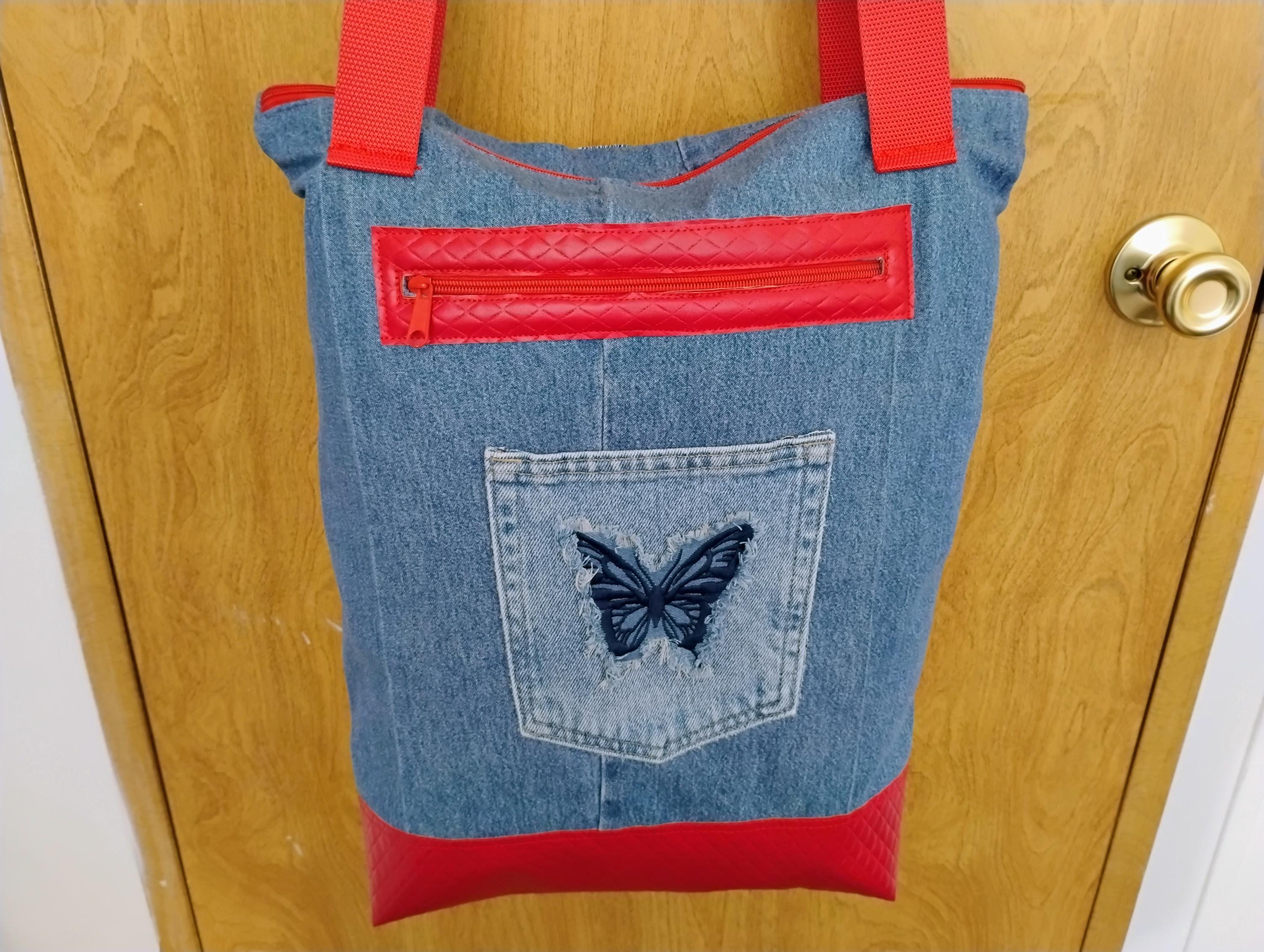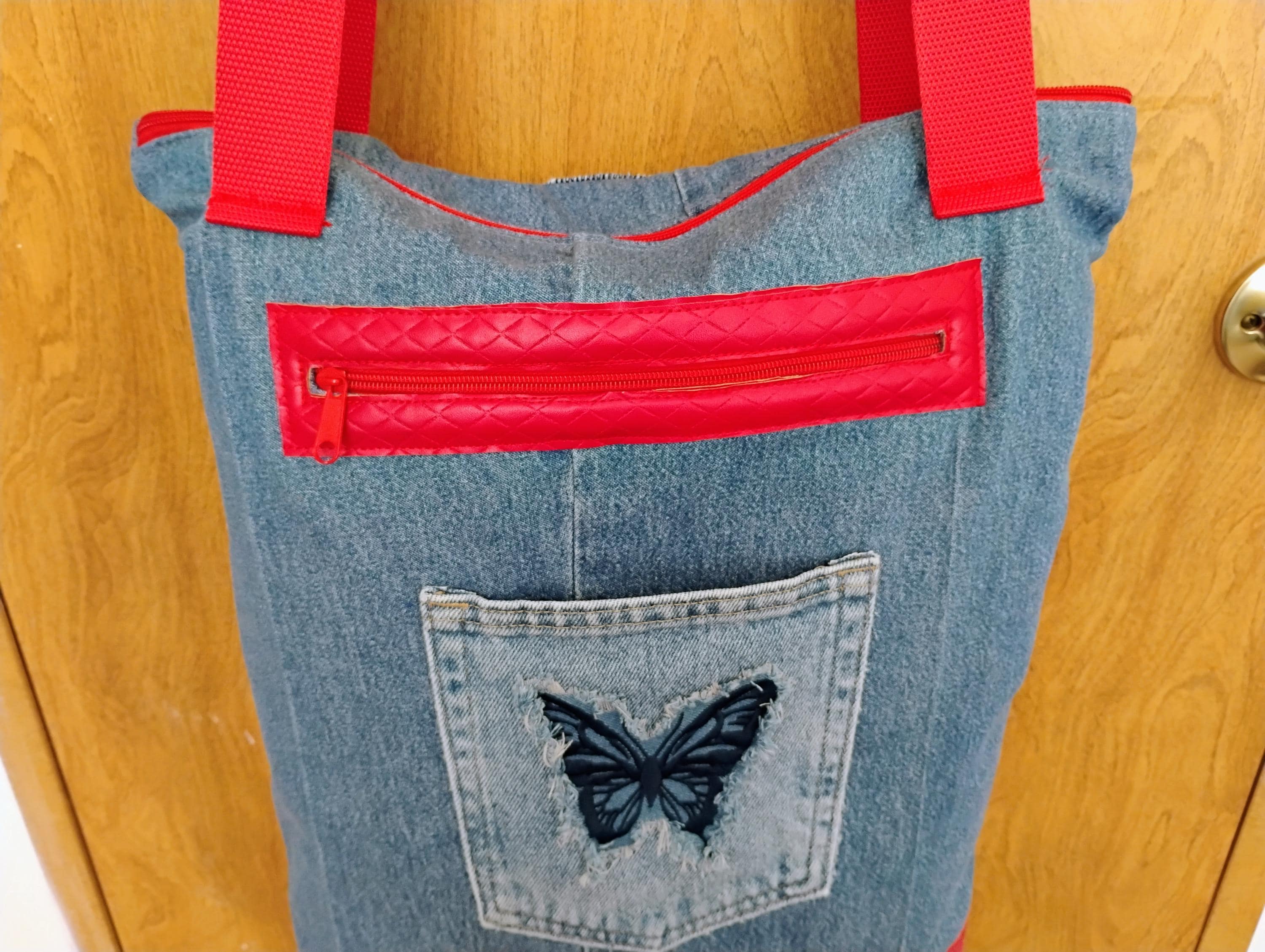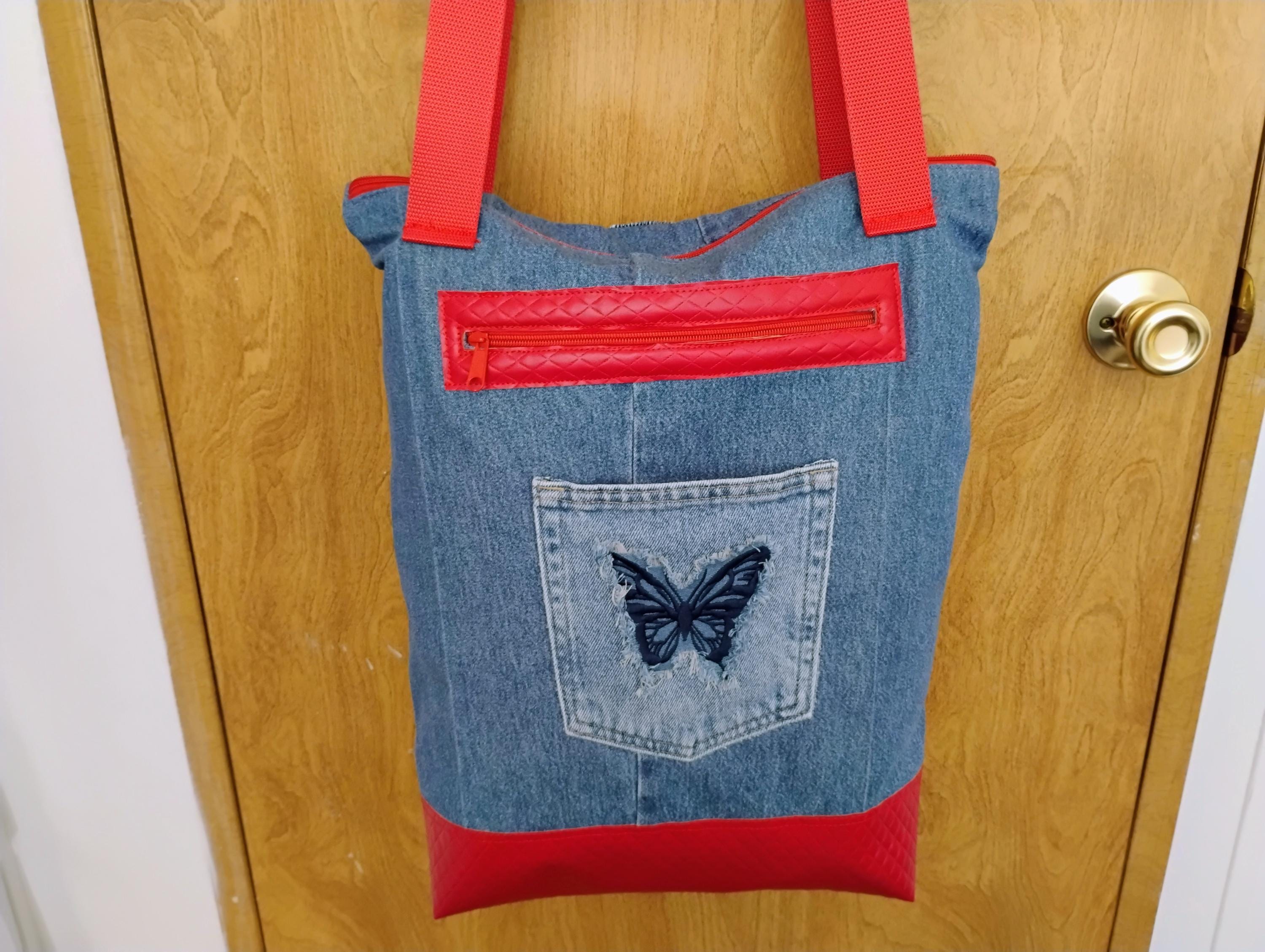 This is an incredible bag with endless possibilities! It's an extra-large bag that can serve as a beach bag, book bag, overnight bag, weekender bag, library bag, craft bag, work bag, and more. Let your creativity run wild! It also makes a fantastic gift for a friend or loved one if you don't need it. The bag is 17.7 inches tall, 13 inches wide, and 4 inches deep. It's crafted from recycled jeans, cotton fabric, and faux leather. The front features a stunning design of a lady in a sunhat, while the back includes a zippered pocket with a decorative faux leather overlay and a jean pocket adorned with a butterfly. The top has a secure zipper closure with a keychain designed to resemble the lady's lips. Inside, there’s a zippered pouch on one side and two open pockets on the other for easy access to essentials. With two webbing straps, a neck cushion has been added for comfort and to keep the straps together when in use. The strap can be adjusted for crossbody or shoulder wear. It is specially designed and handmade. Brand new with tags.