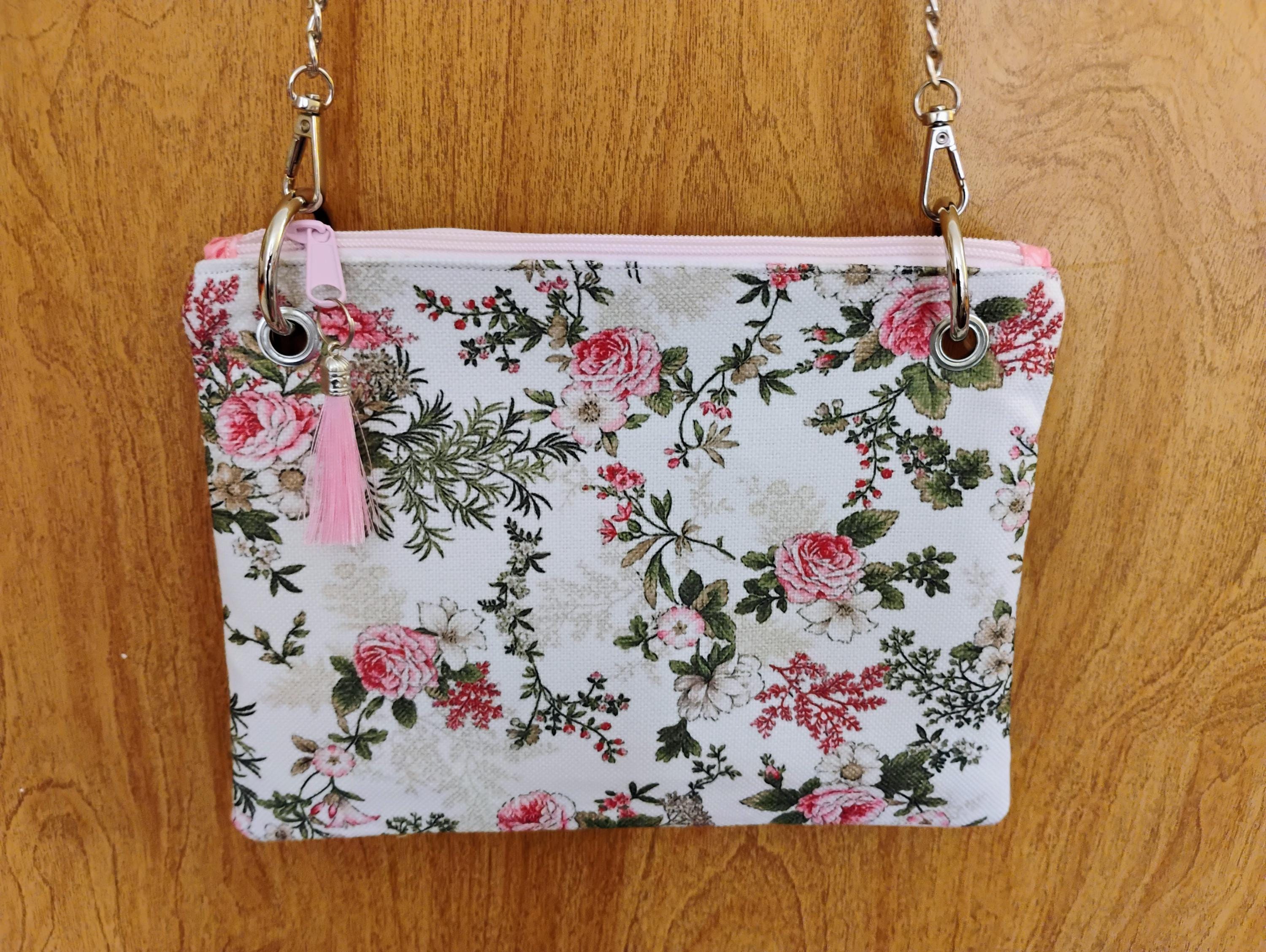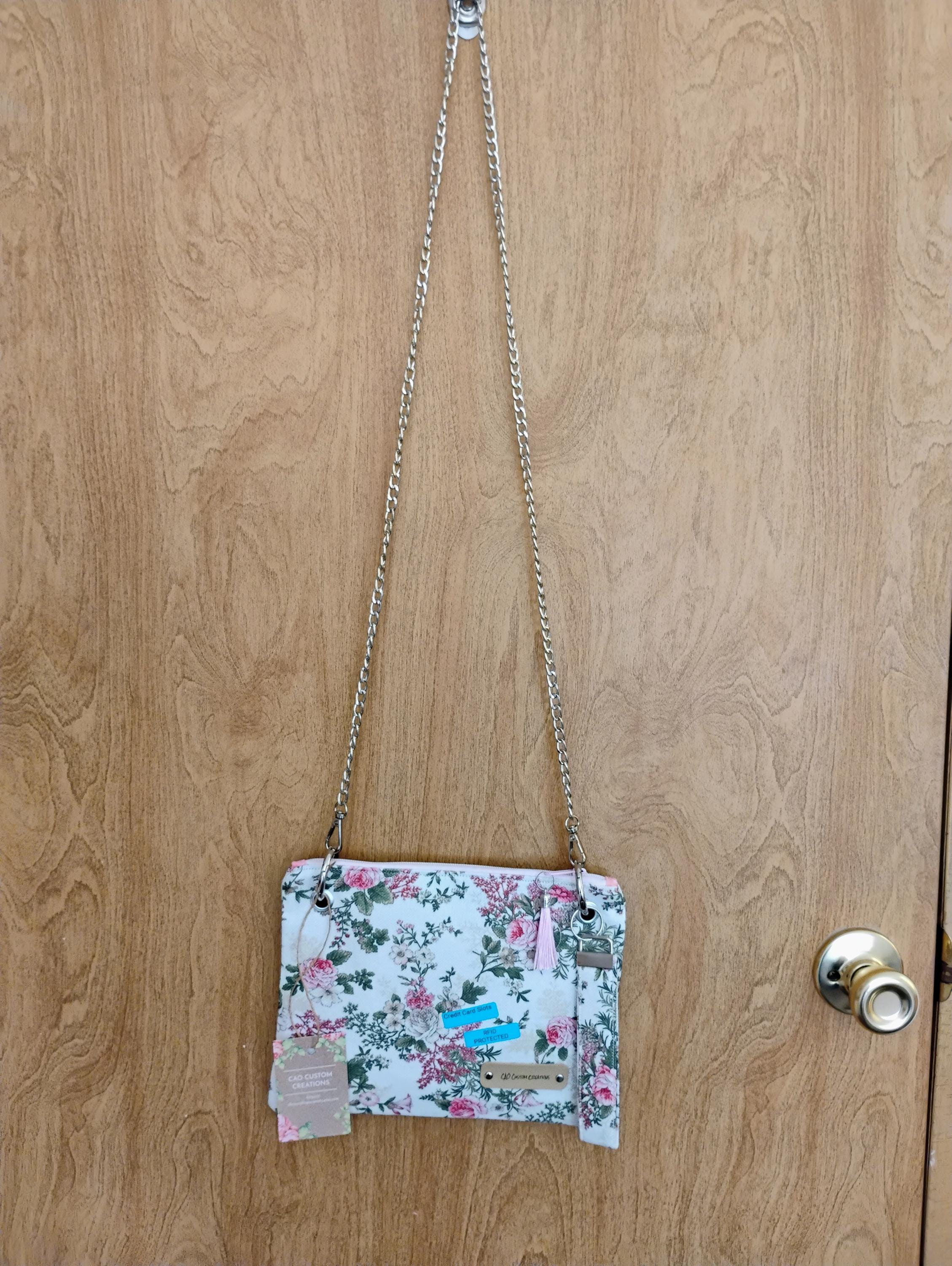 This elegant and delicate bag features a lovely pink floral lining. Inside, you'll find credit card slots and two open pockets for added convenience. Crafted with RFID material throughout, it offers protection for your phone, credit cards, and more. The matching key fob wristlet enhances its charm and value. The chain shoulder strap is removable, allowing you to convert it into a wristlet as needed, and the wristlet itself can also be detached. Sturdy grommets on both sides add durability to this stylish purse. 9.5 x 7,5 x .05 inch