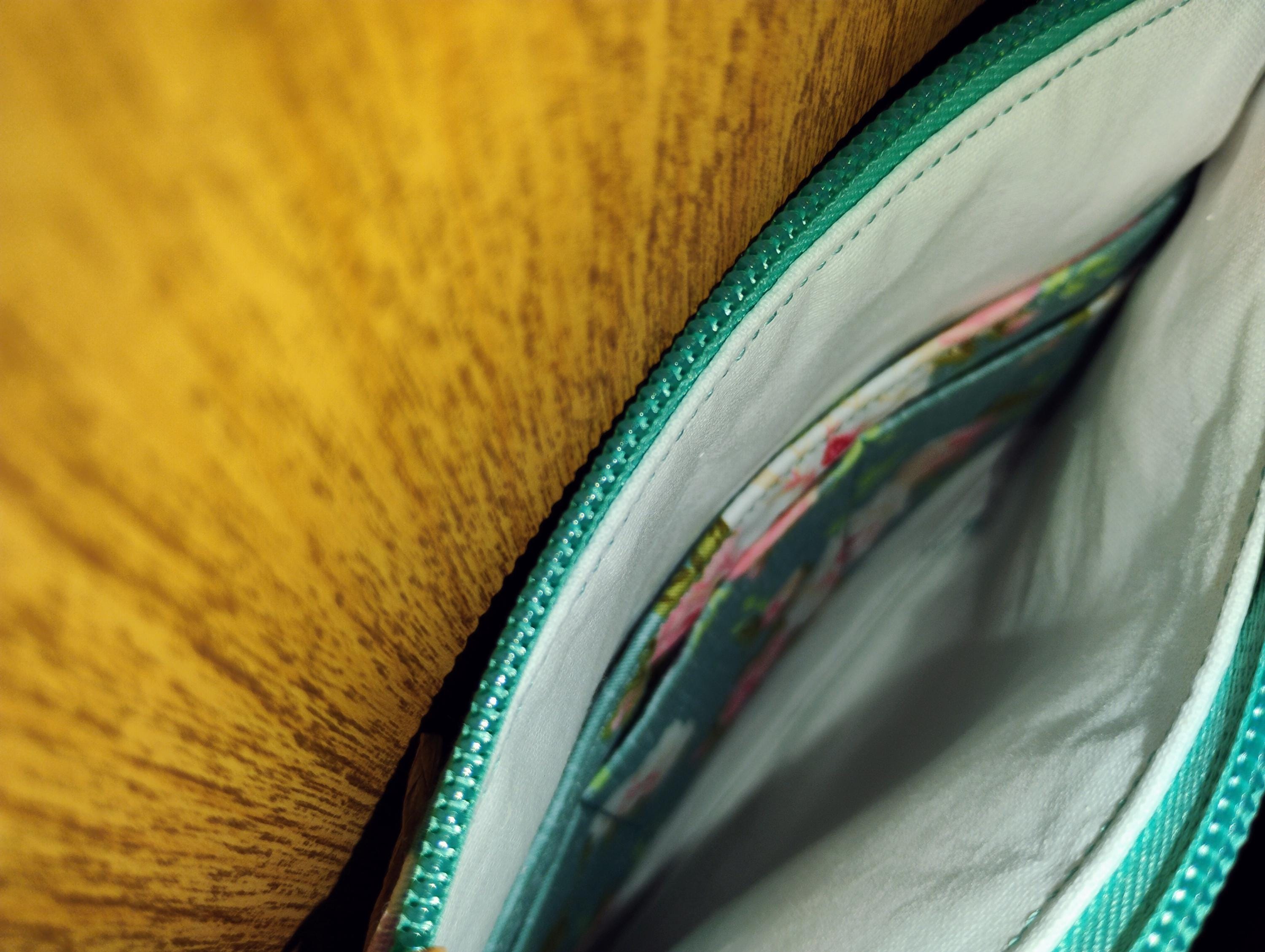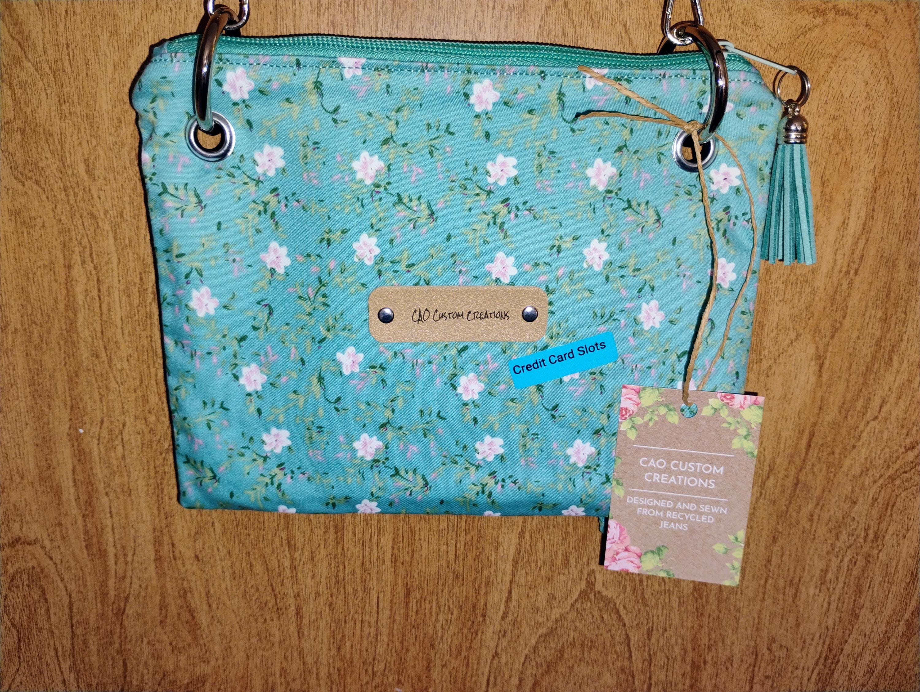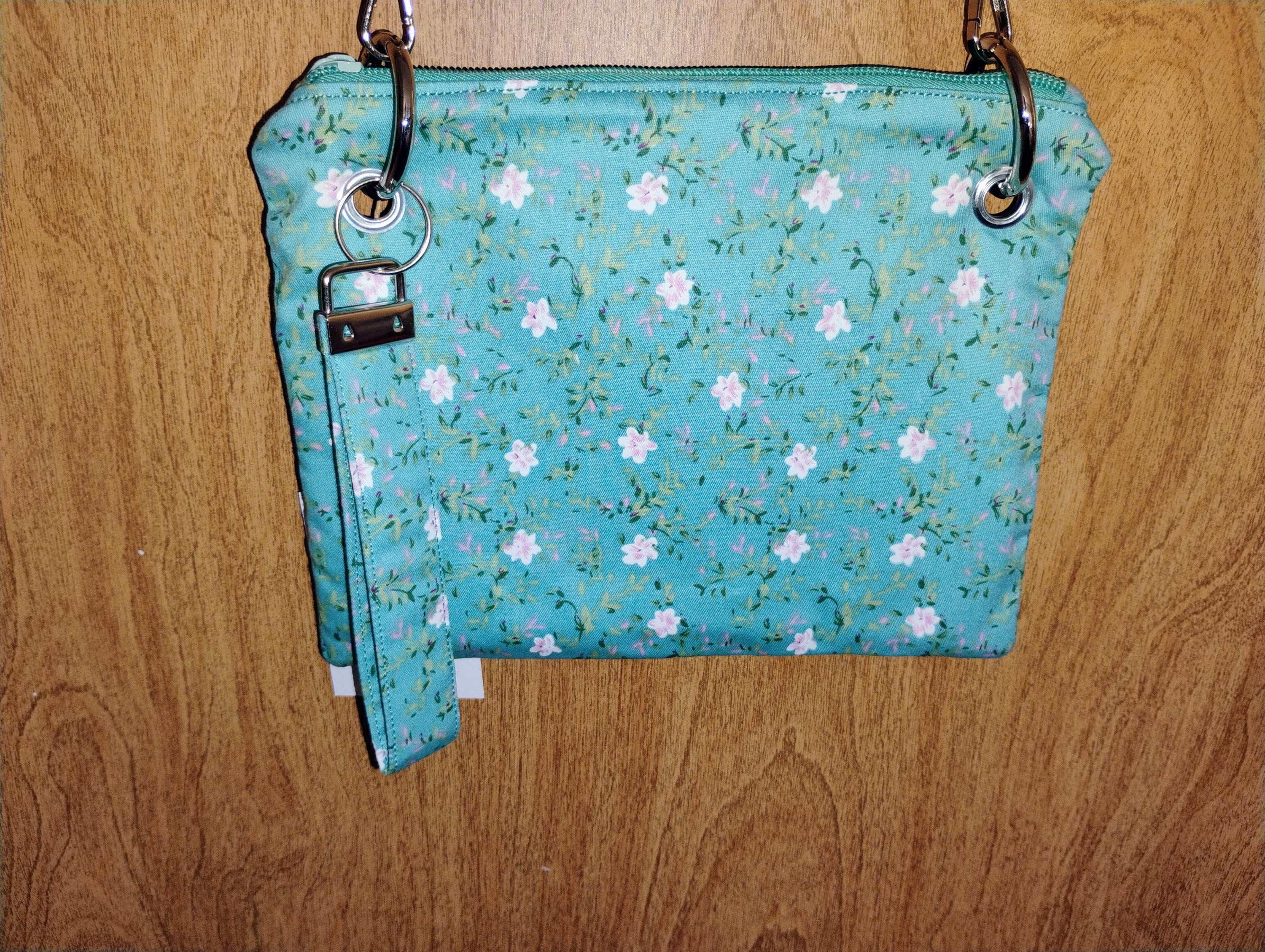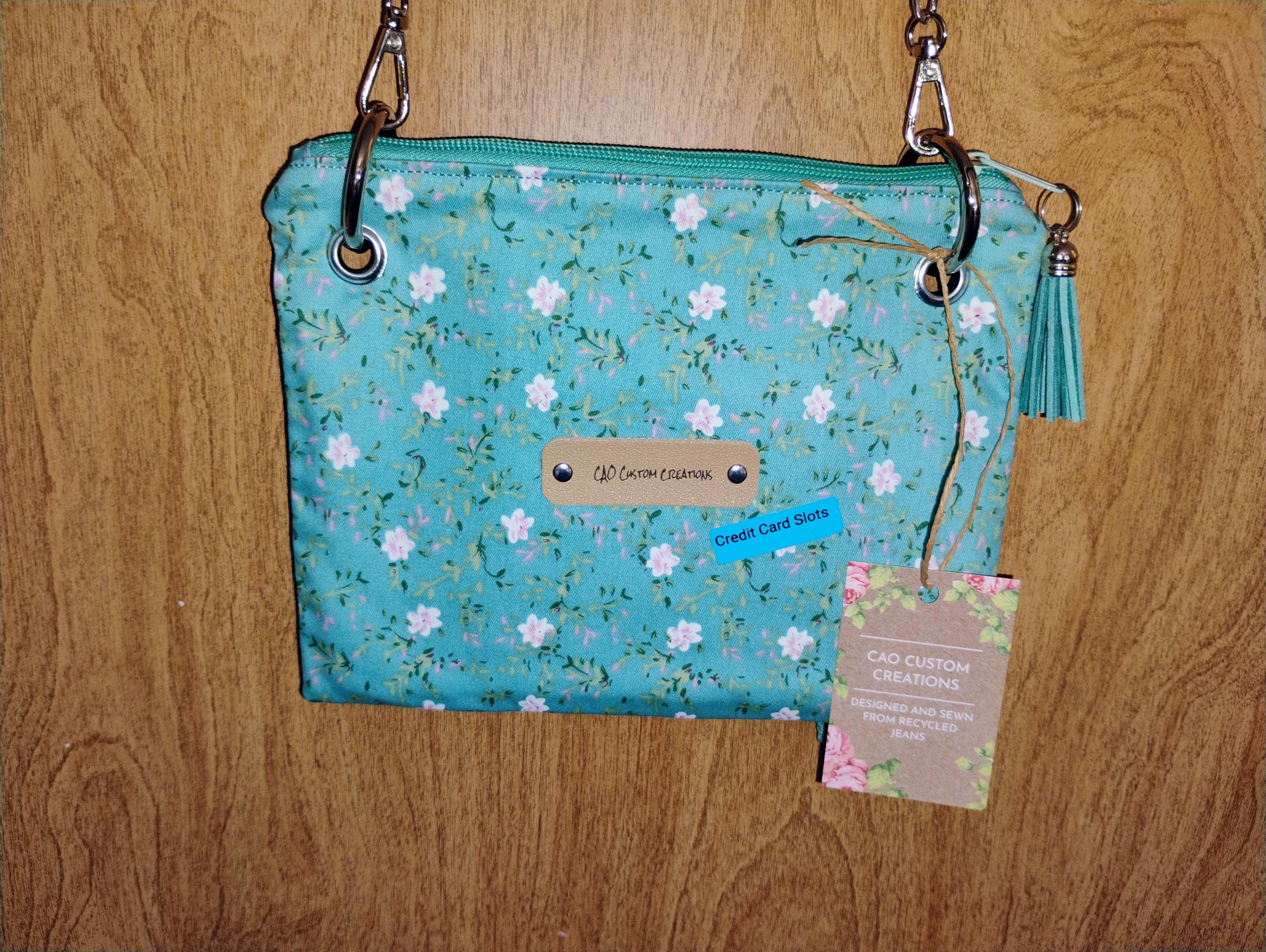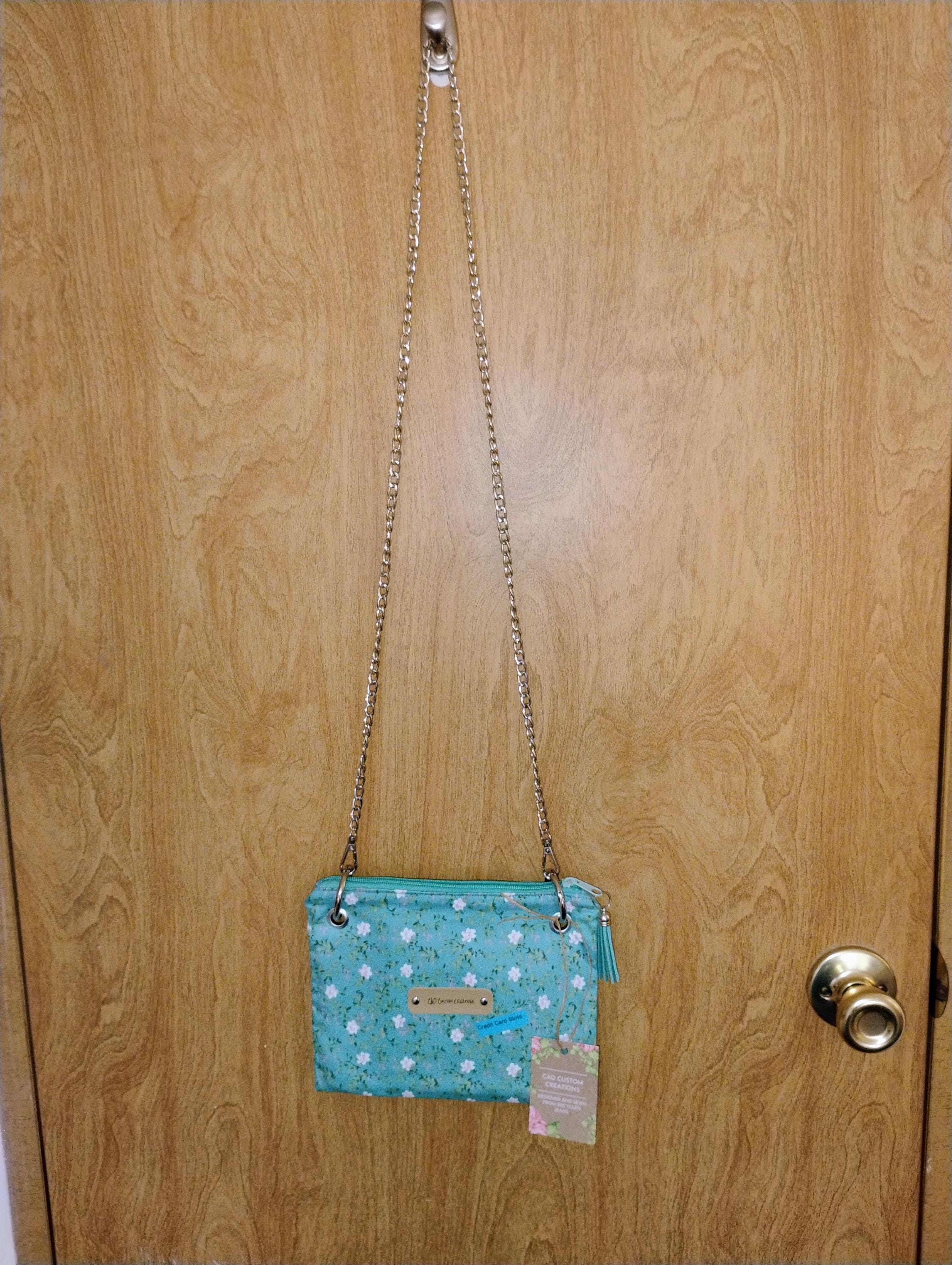 This adorable little purse is versatile and practical. It can be worn crossbody or used as a wristlet. Inside, there are credit card slots, so you can leave your wallet behind. The chain strap is removable for wristlet use, and the wristlet can double as a key fob. there is a zipper closure. Sweet, simple, and eye-catching, the bag measures 8.5 x 6.5 x 0.25 inches.
