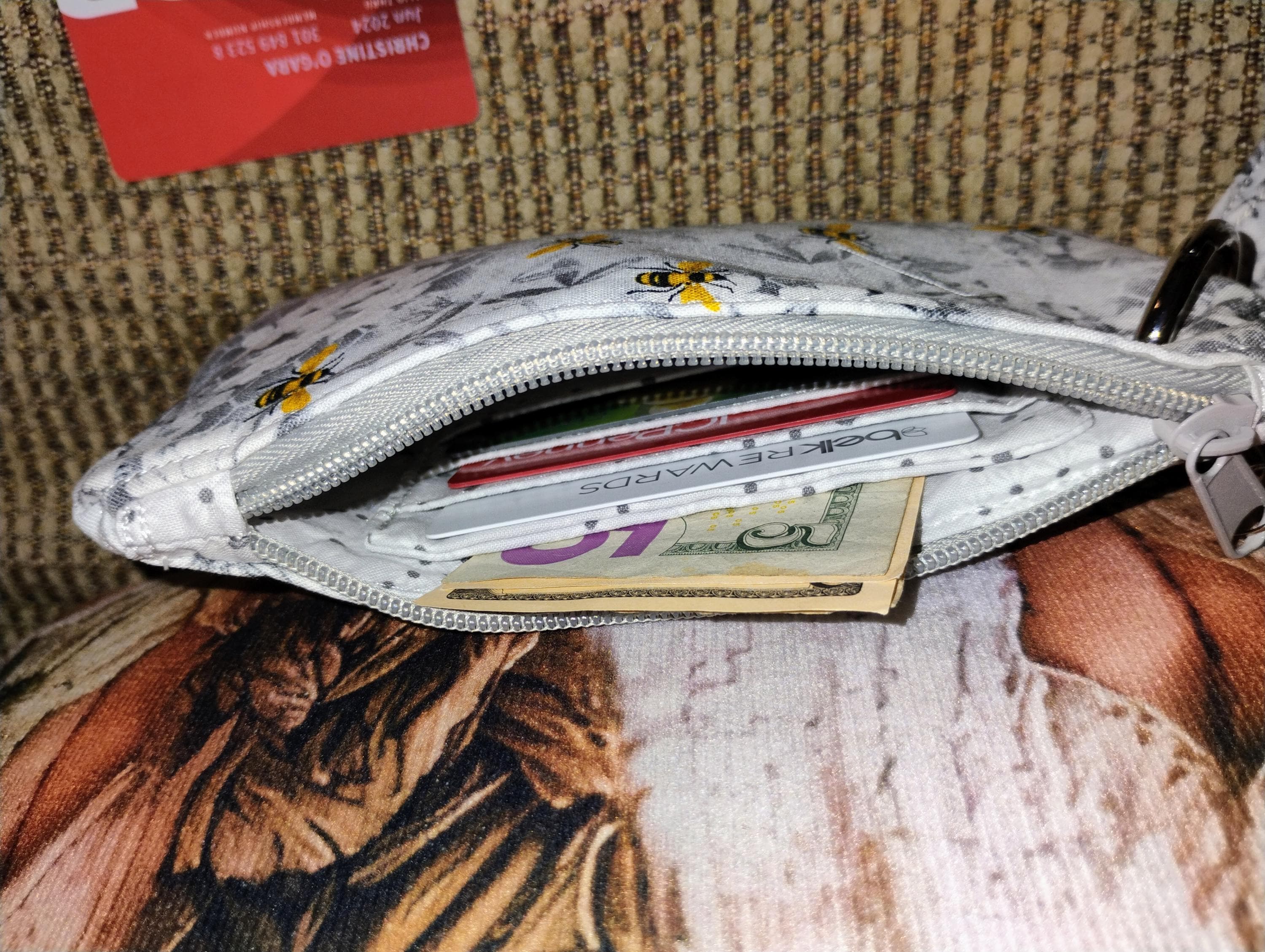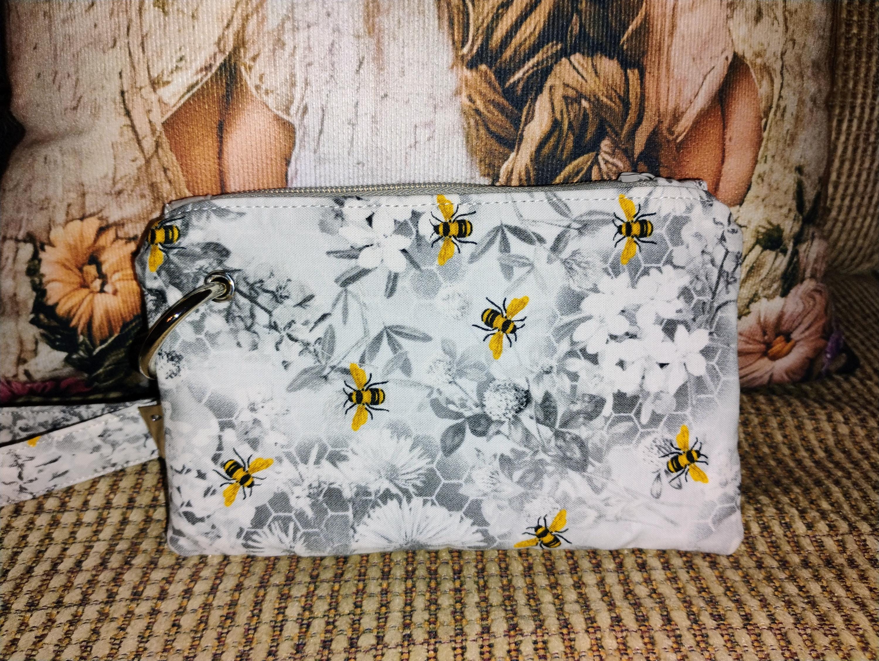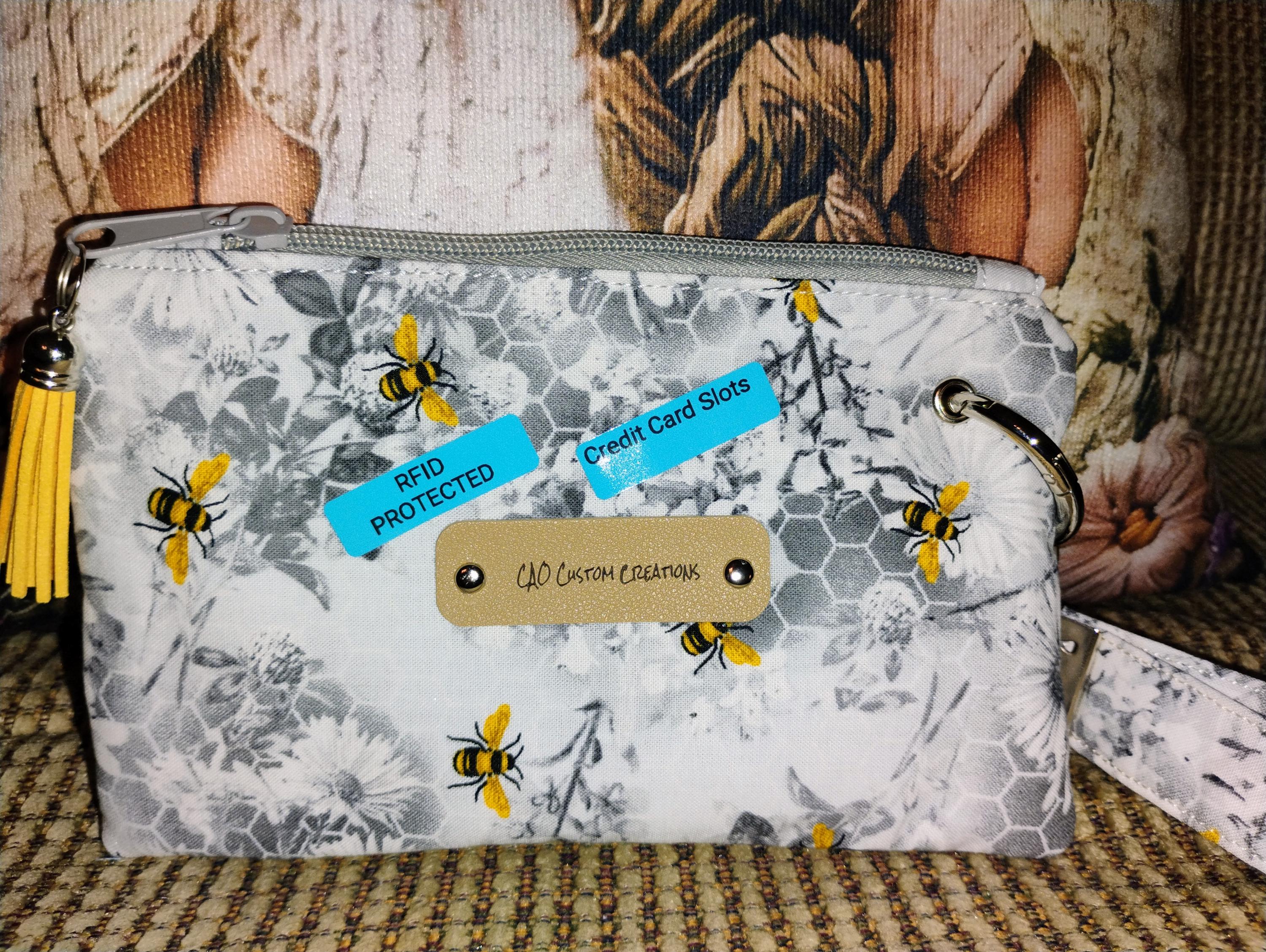The Busy Bees wristlet is ideal for anyone on the move who wants to travel light. It features an RFID-lined interior to keep your belongings safe from potential credit card scanners in crowded areas. With card slots and a dedicated cash pocket, it keeps your license and cards easily accessible. The matching wrist strap also serves as a key fob, and the wristlet secures everything with a convenient zipper closure.