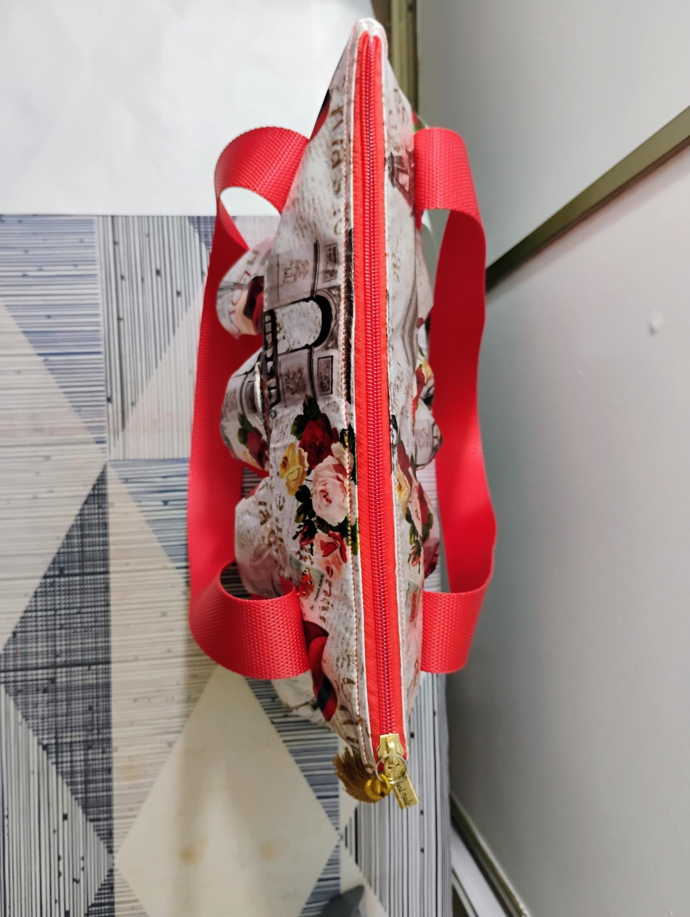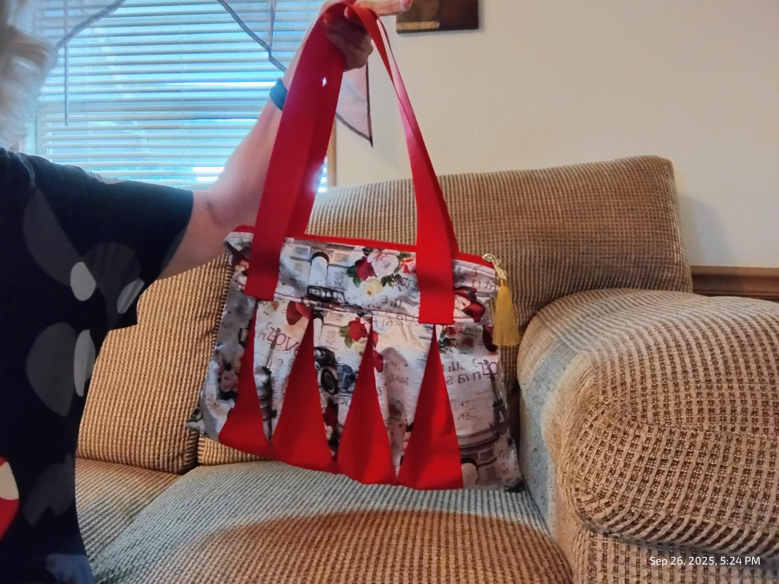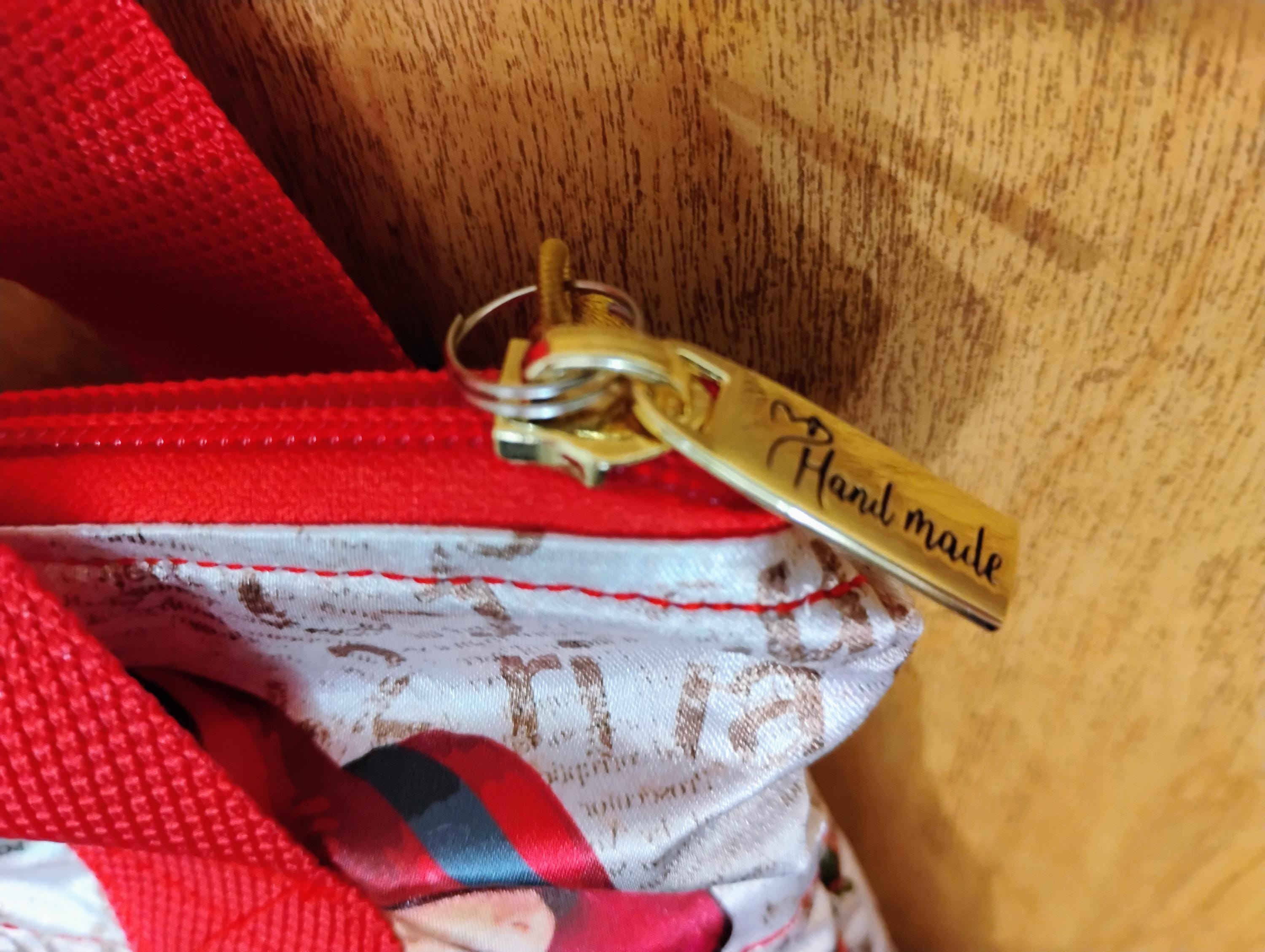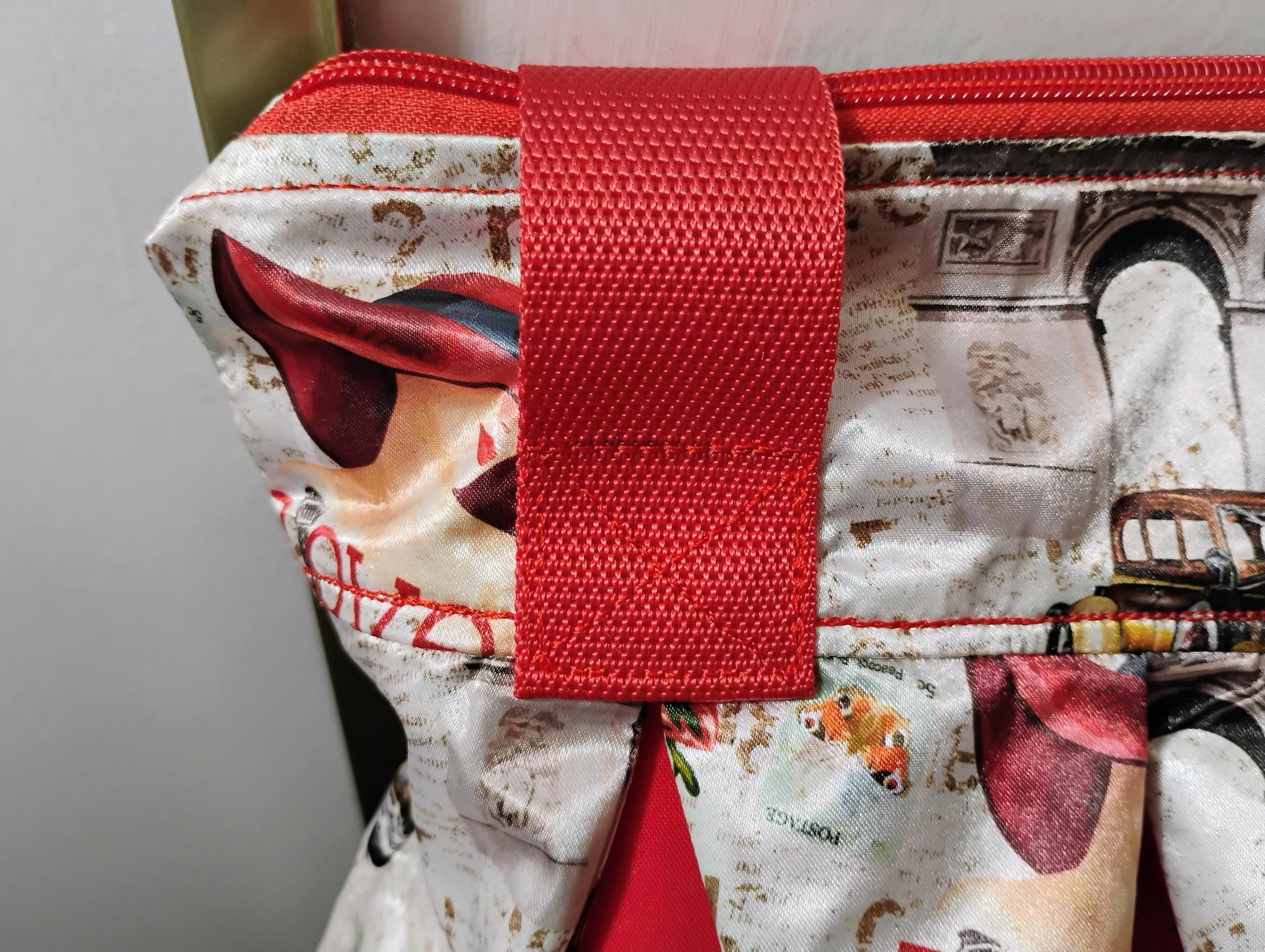 This twisted panel bag is both playful and elegant. Red cotton and silk panels alternate to form a stunning design for this charming purse. It features a zipper closure and a web shoulder strap. The interior is roomy enough to accommodate all your essentials.
