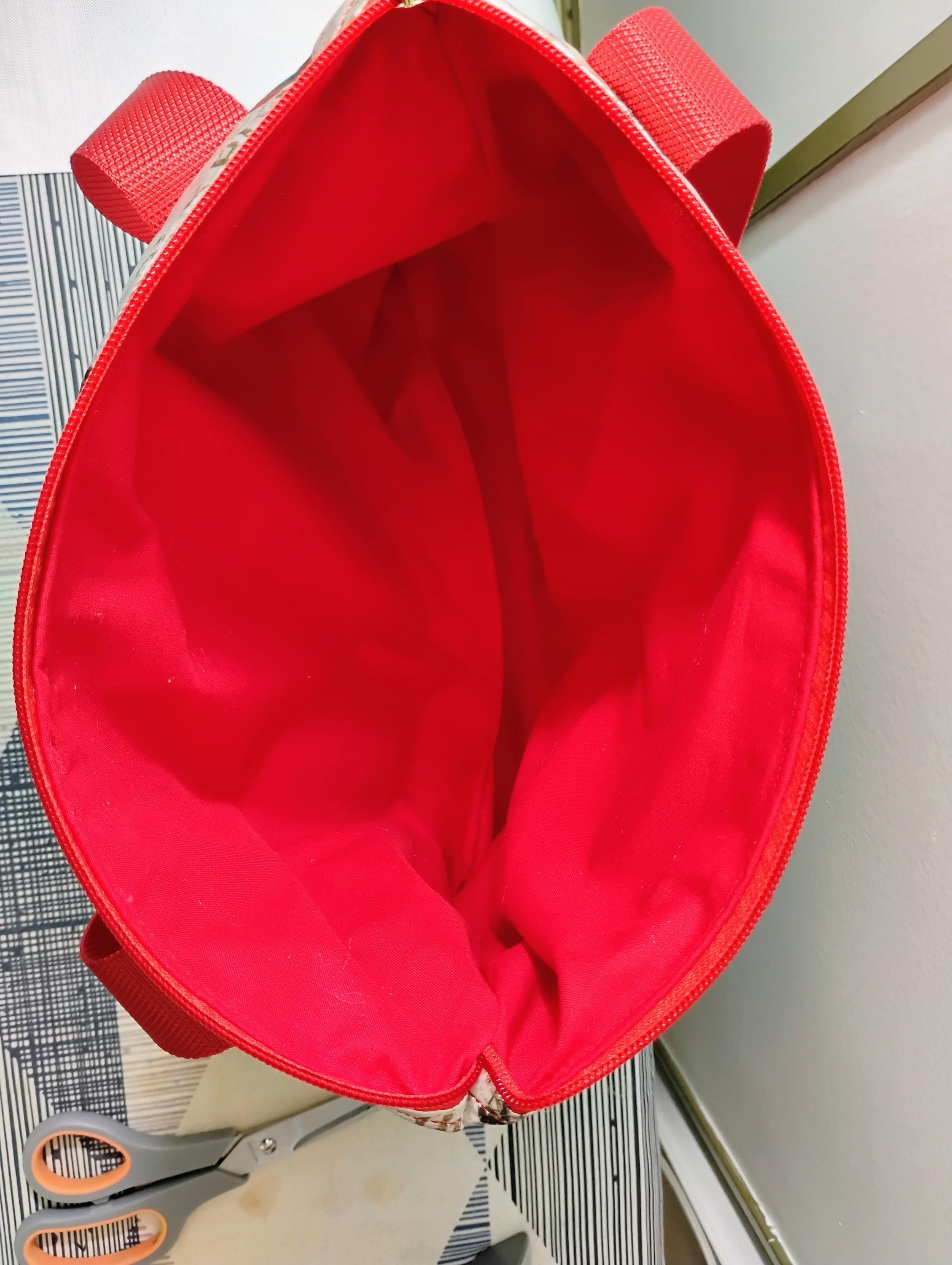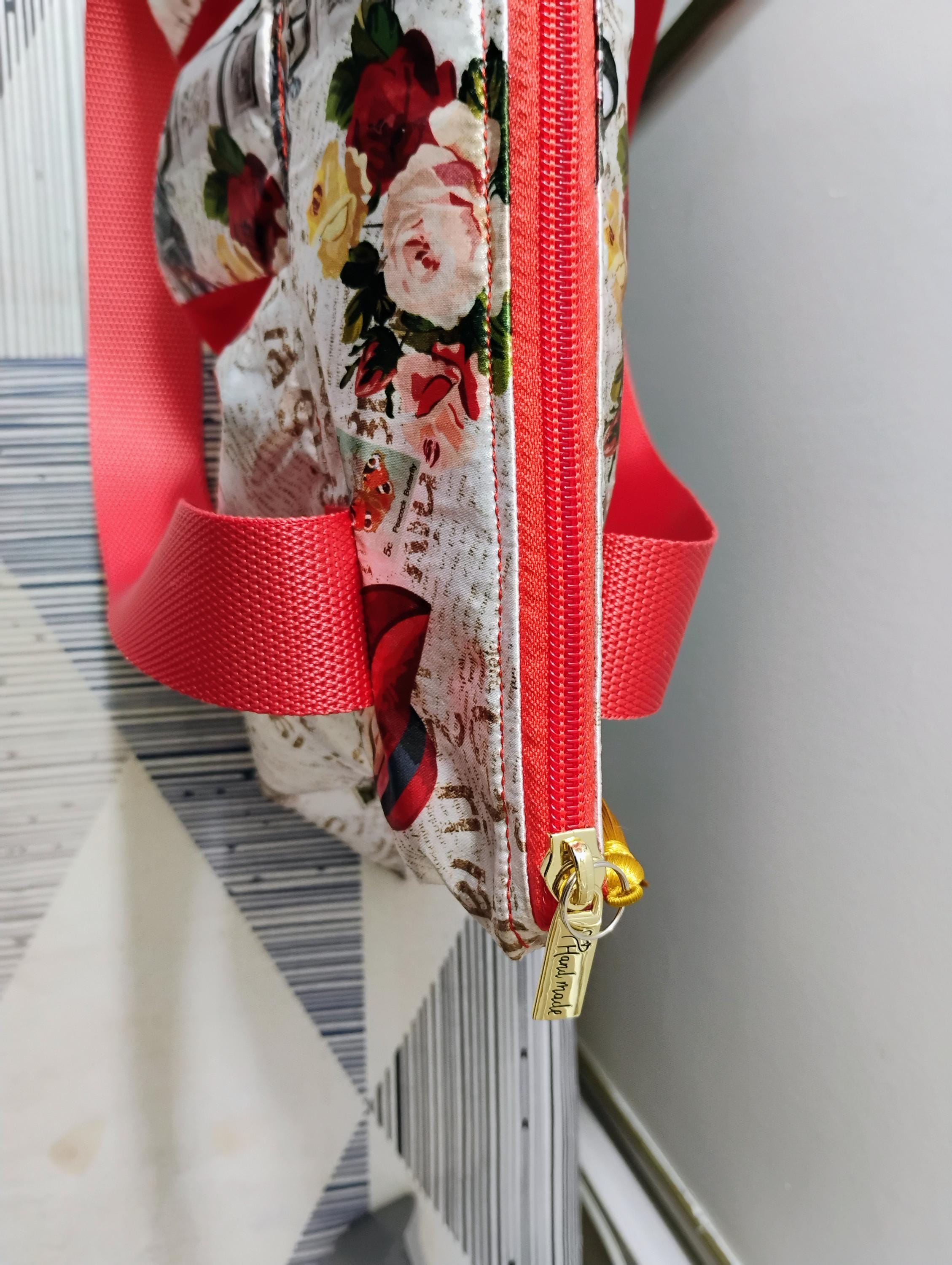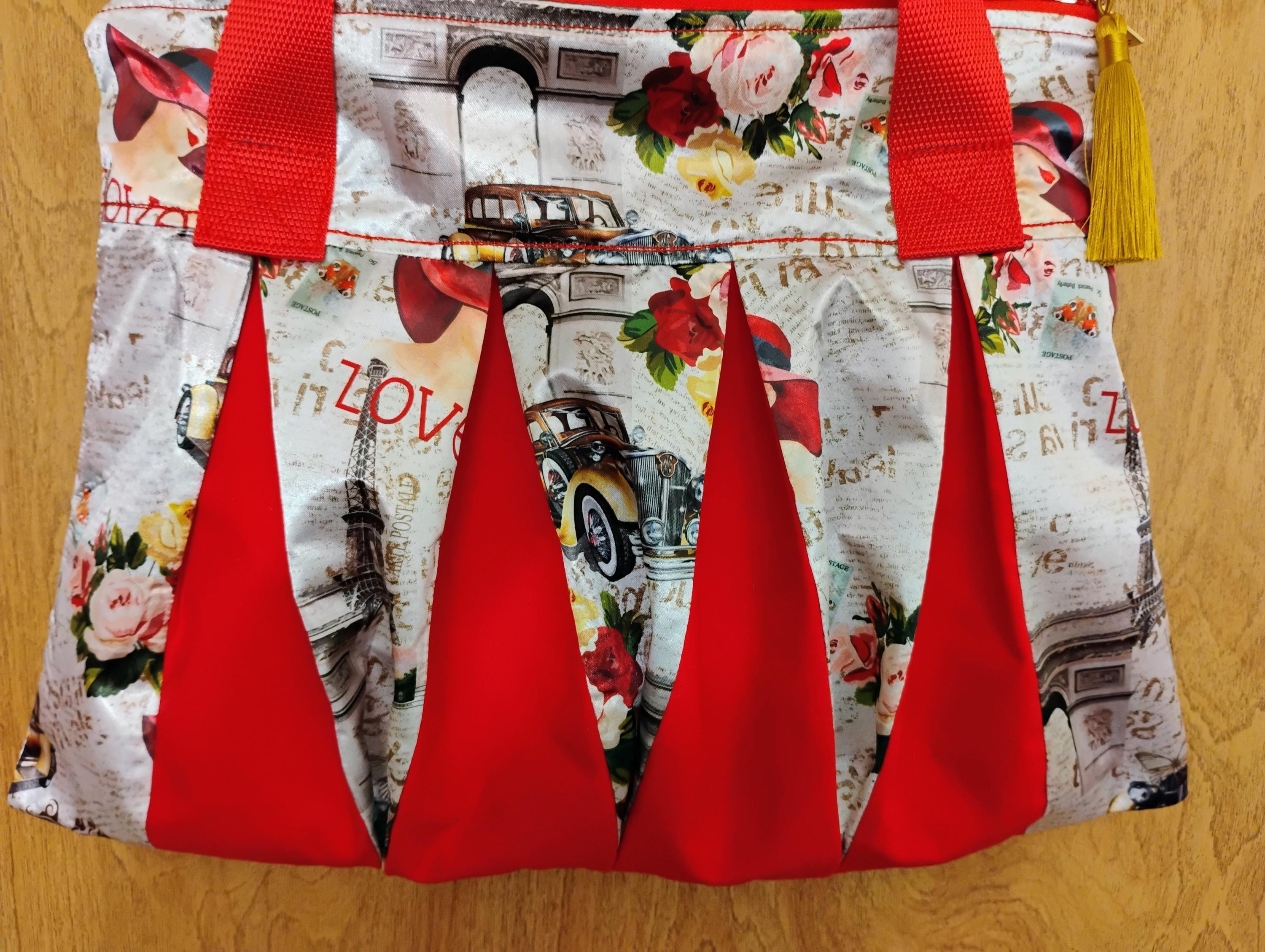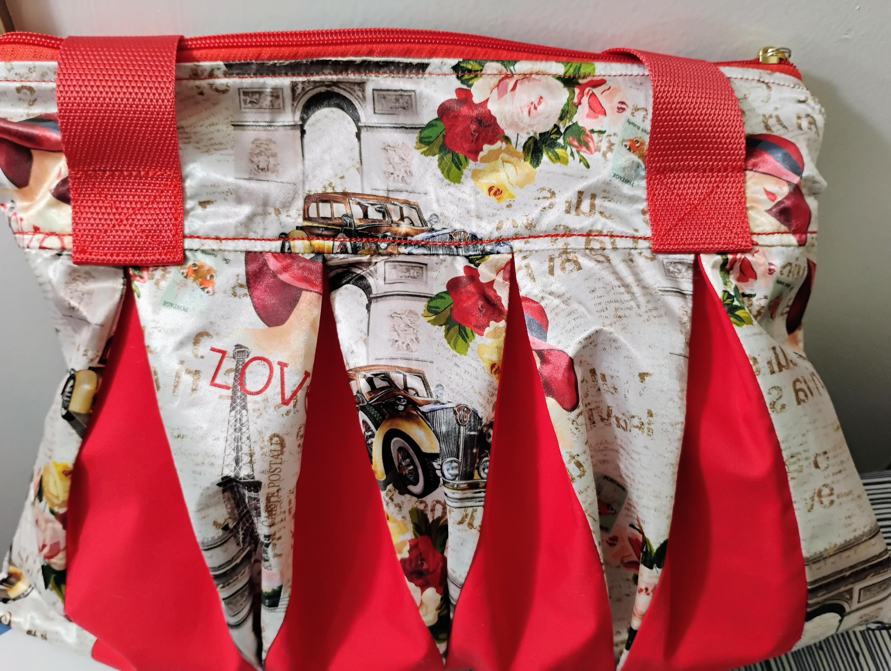 This twisted panel bag is both playful and elegant. Red cotton and silk panels alternate to form a stunning design for this charming purse. It features a zipper closure and a web shoulder strap. The interior is roomy enough to accommodate all your essentials.