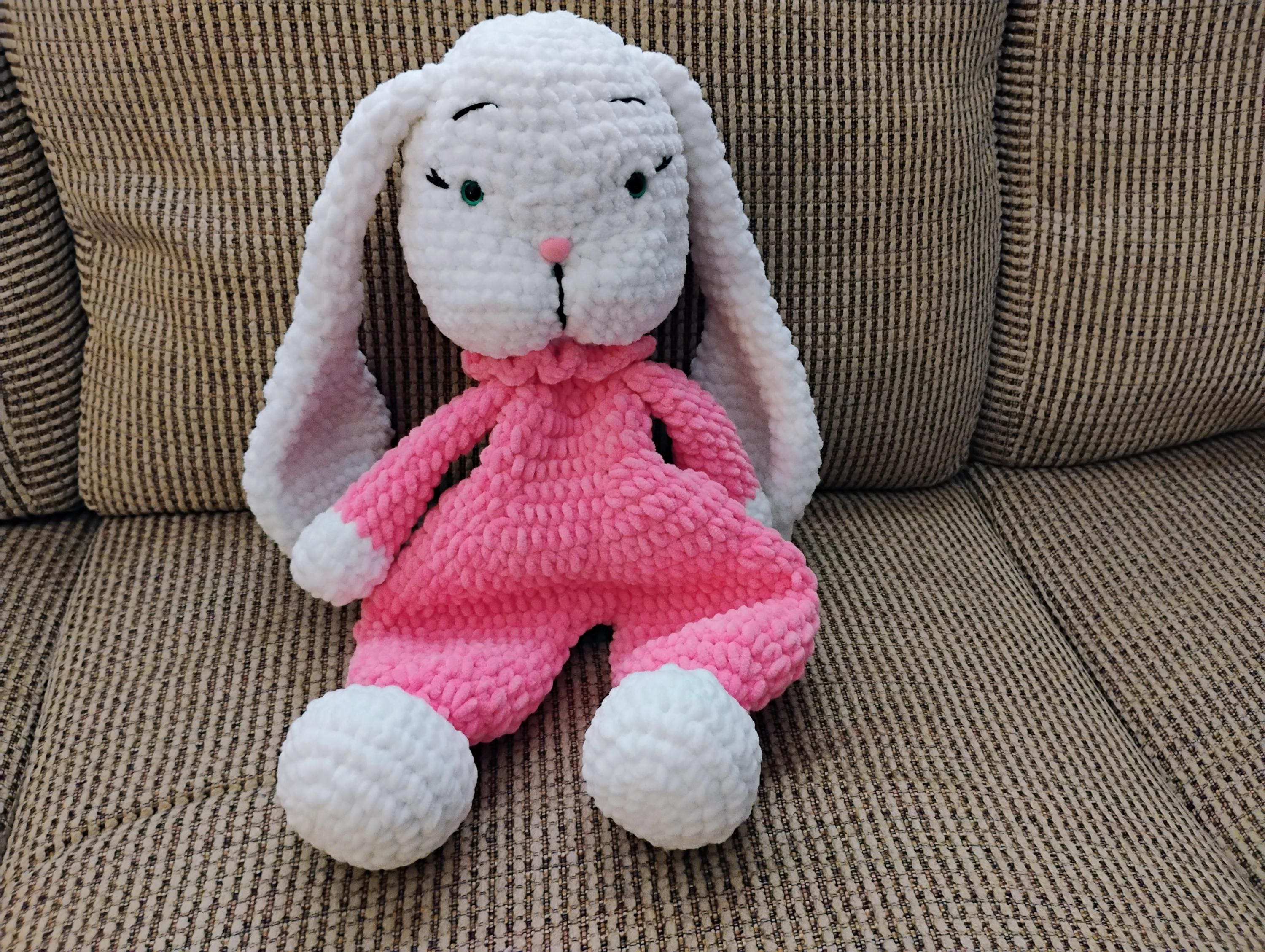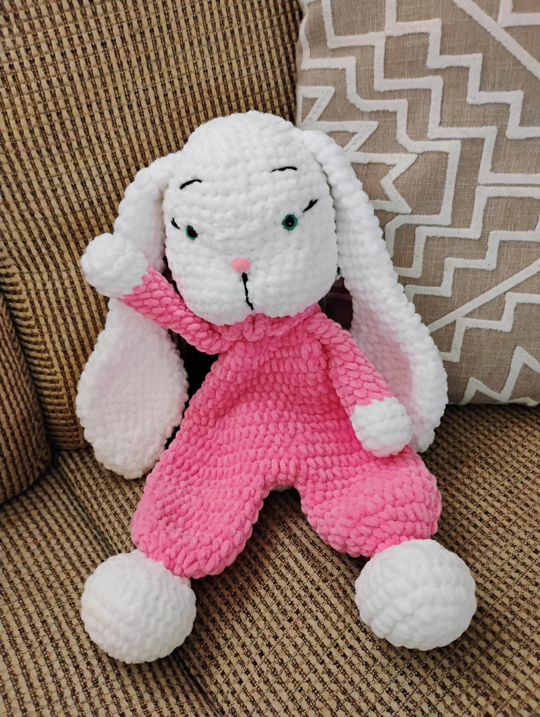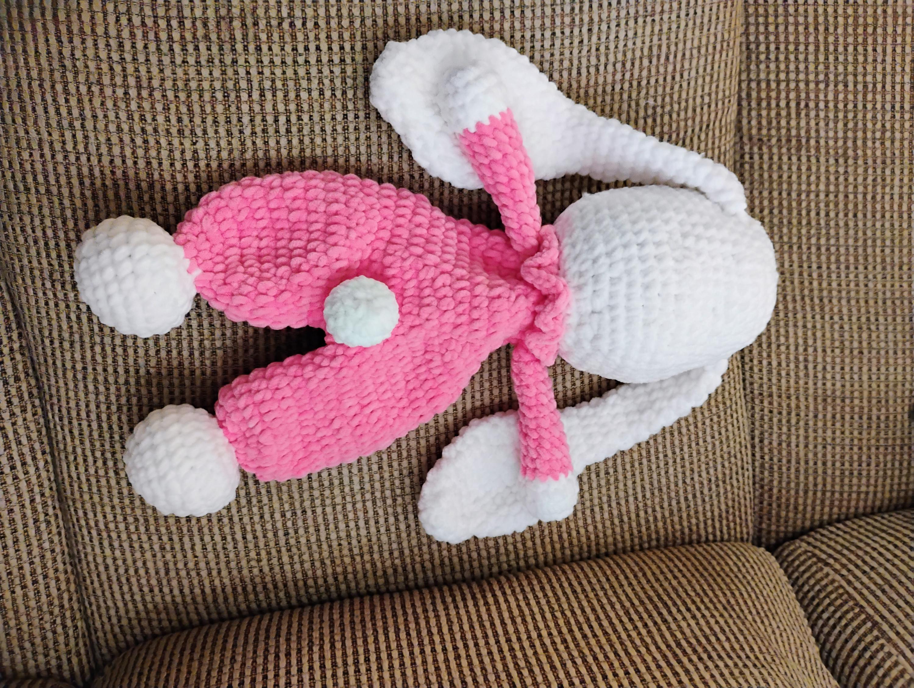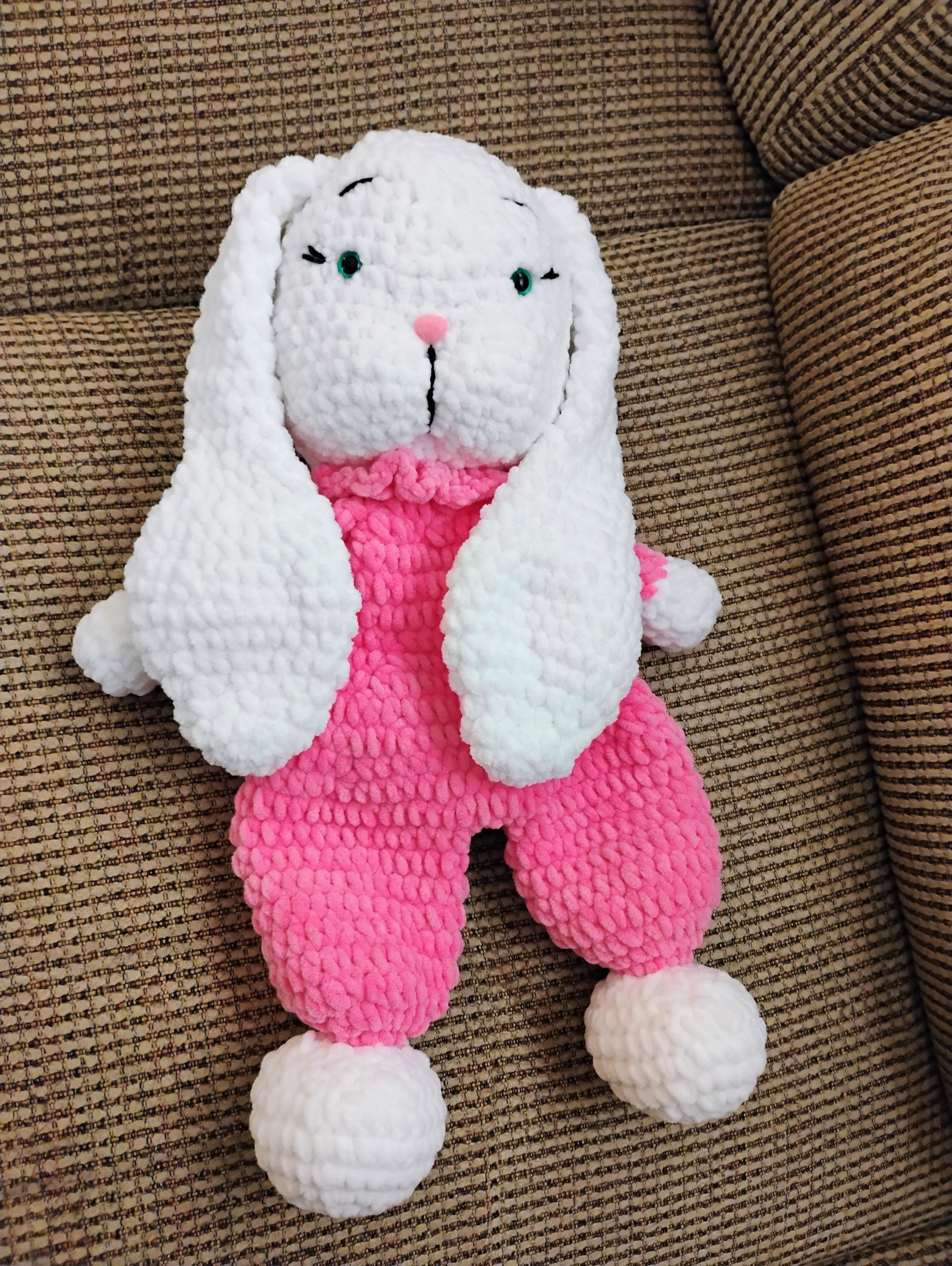 This adorable snuggle bunny is handcrafted and crocheted by me using super soft chenille crochet yarn. Only the head, hands, and feet are filled with fiber fill, while the body, legs, ears, and arms are flat. It's a delightful gift for both children and adults, measuring 18 inches in length. I don't crochet often anymore, but when I saw this pattern, I absolutely fell in love with it. Shipping extra.