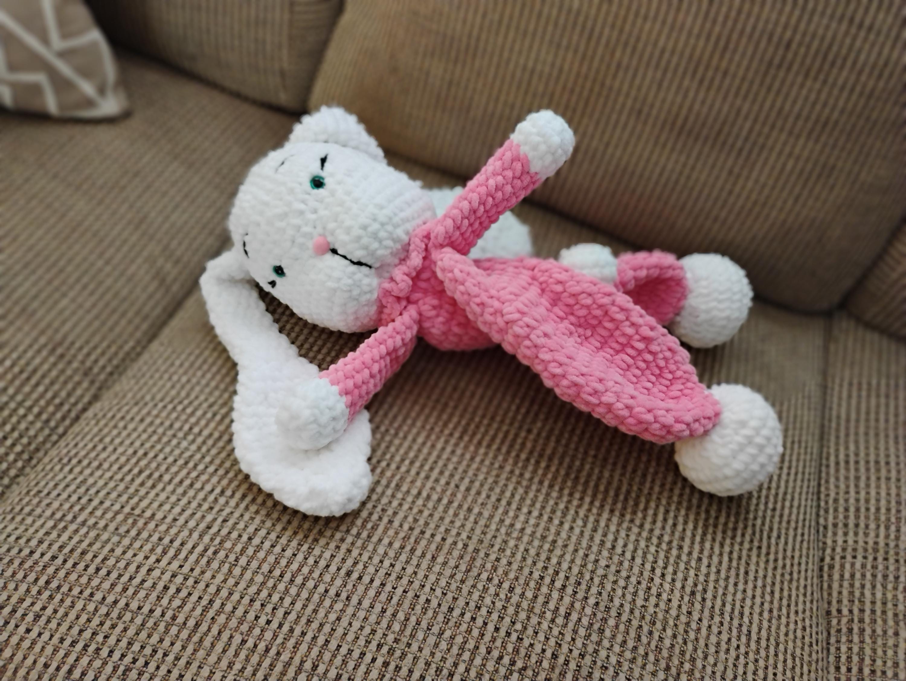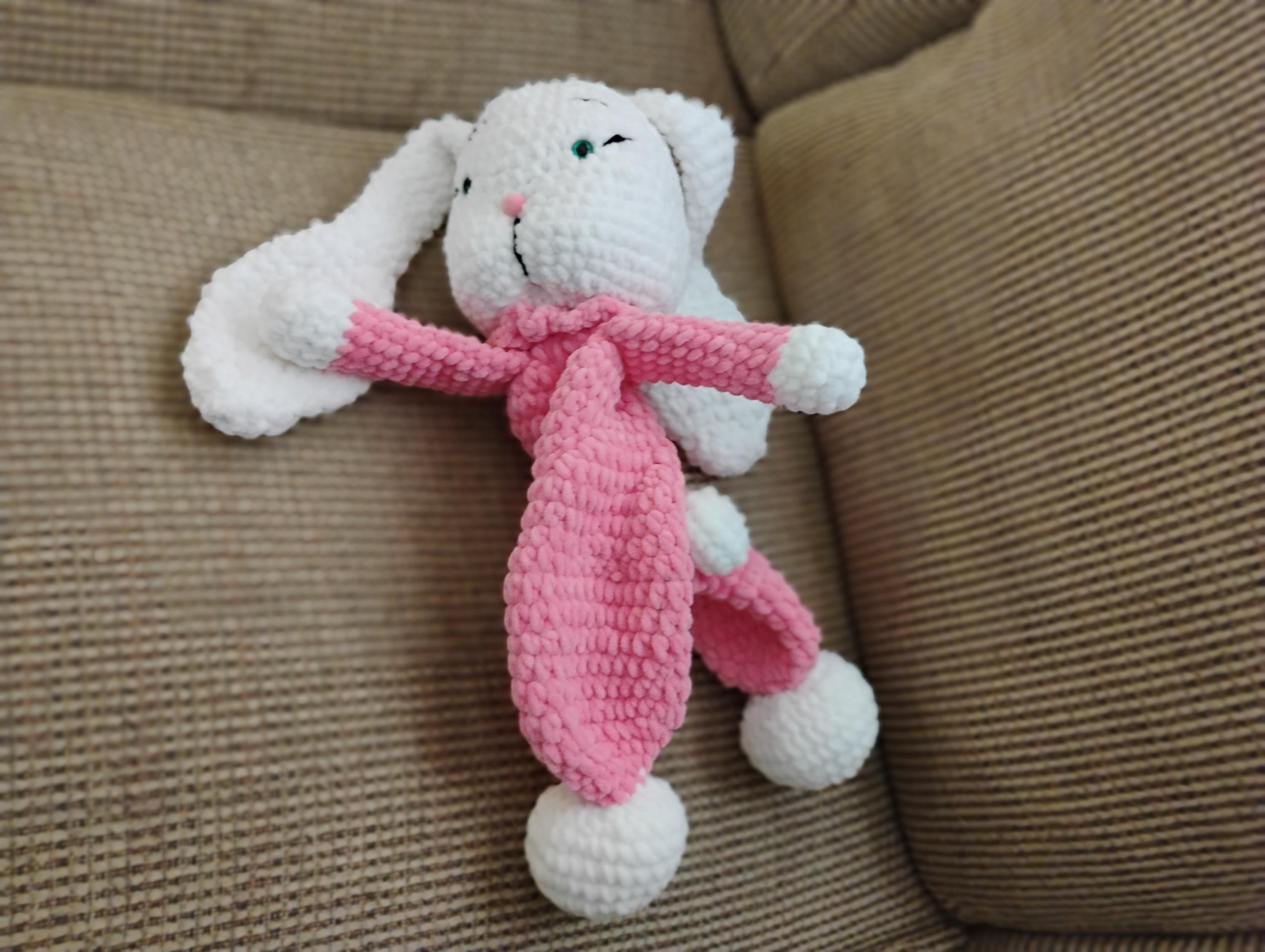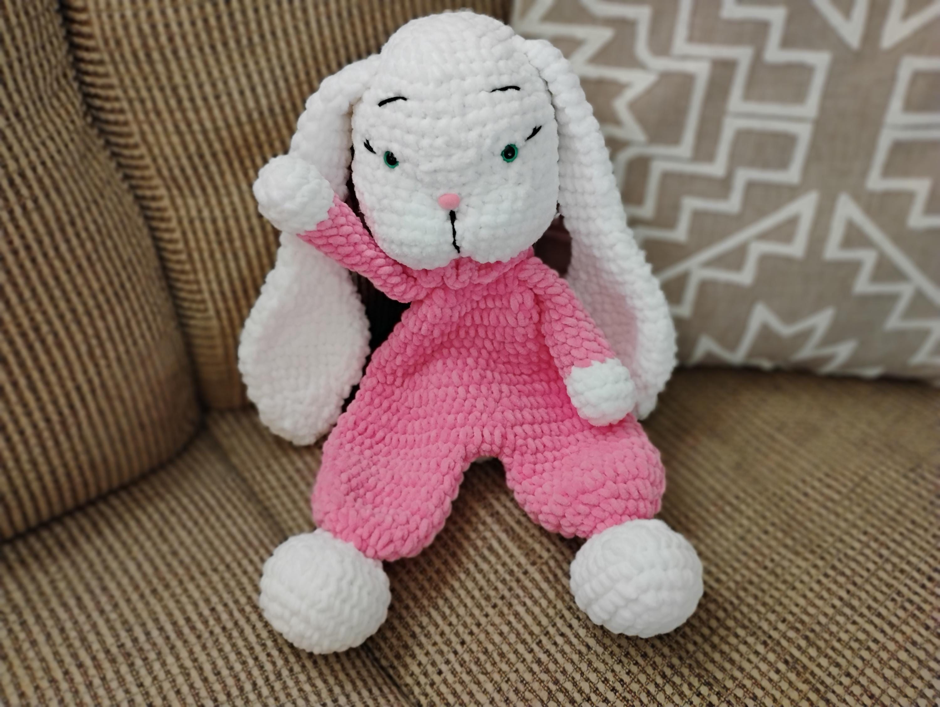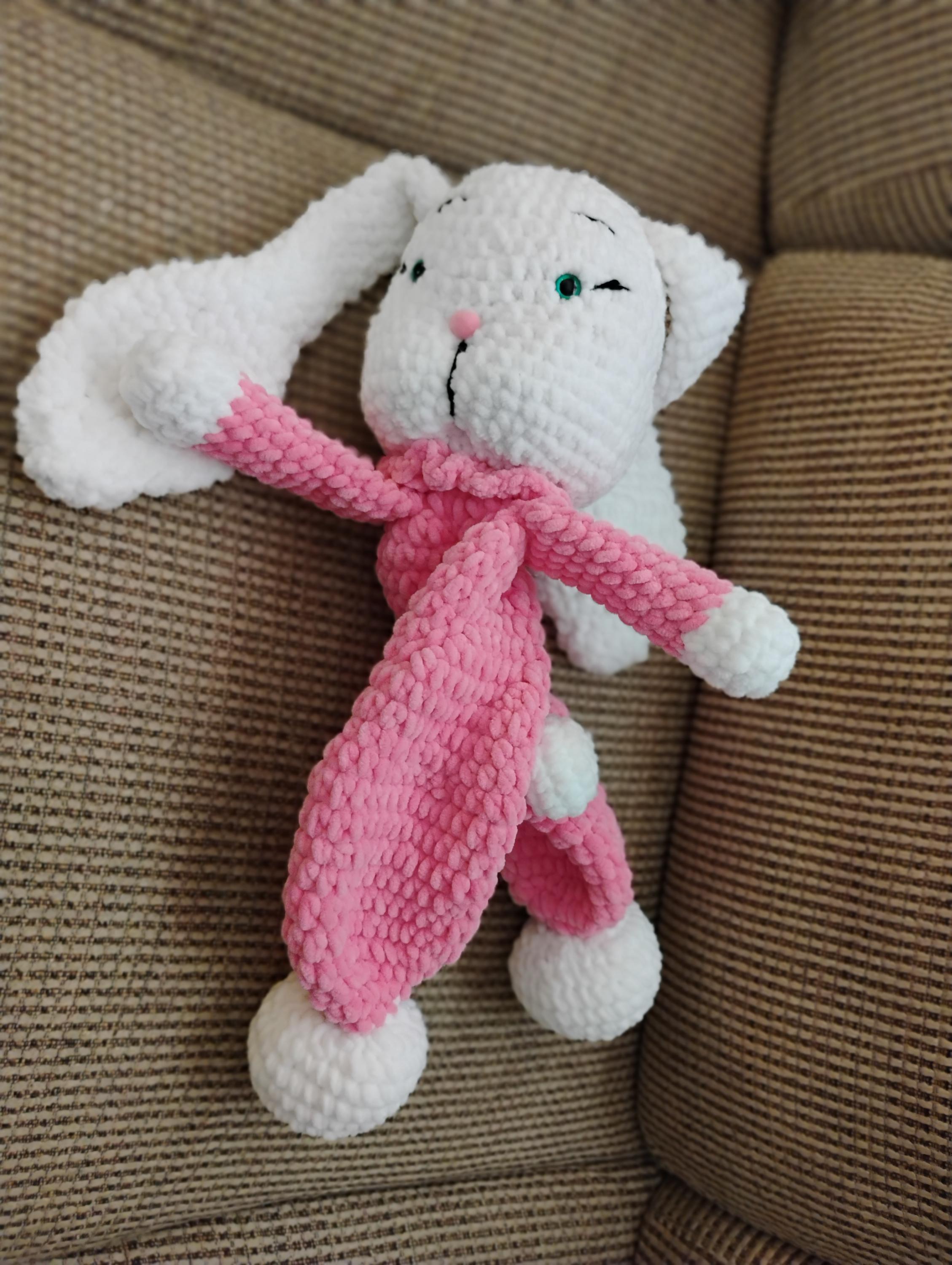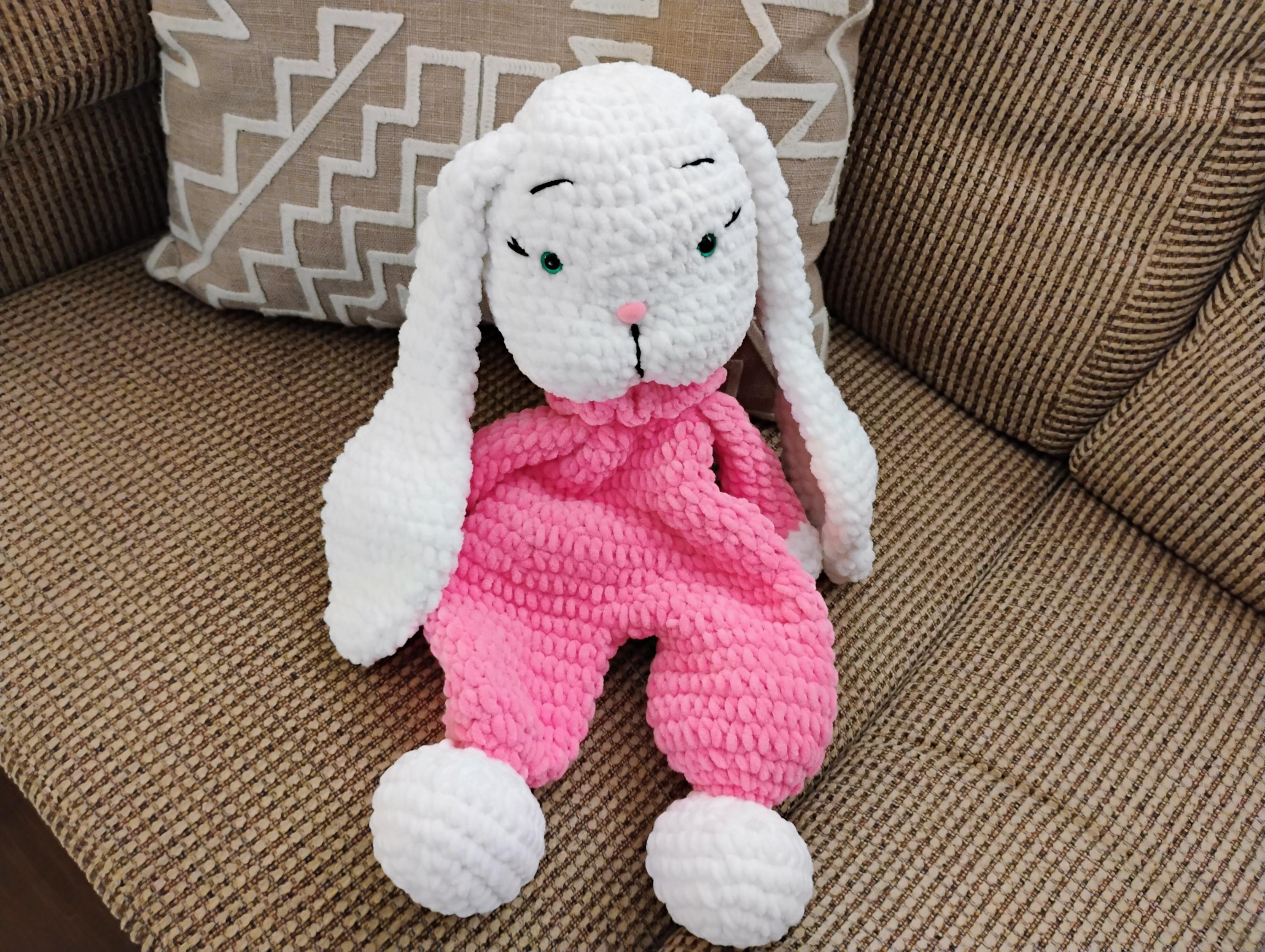 This adorable snuggle bunny is handcrafted and crocheted by me using super soft chenille crochet yarn. Only the head, hands, and feet are filled with fiber fill, while the body, legs, ears, and arms are flat. It's a delightful gift for both children and adults, measuring 18 inches in length. I don't crochet often anymore, but when I saw this pattern, I absolutely fell in love with it. Shipping extra.